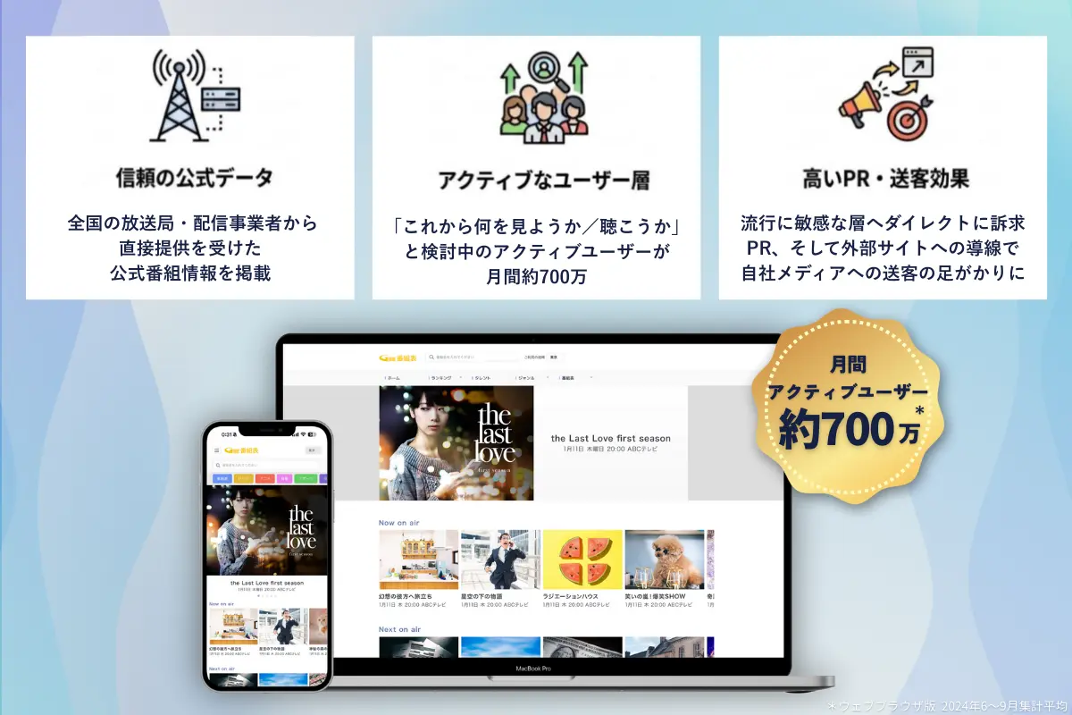 全国の放送局および配信サービスを運営する事業社から公式に番組コンテンツのデータをご提供いただいているモバイルアプリ版の番組表です。月間利用者は約80万人(※8)にのぼります。(※8)2024年10月〜2025年4月集計平均