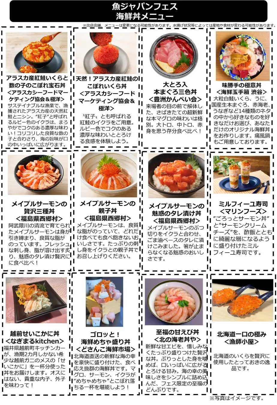 「アラスカシーフードマーケティング協会&極洋」ブースでは、昨年11月の日比谷公園で登場し、大人気となった「アラスカ産紅鮭いくらと数の子のこぼれ宝石丼」を販売します。100%天然で、サステイナブル(持続可能)な漁業によって漁獲されたアラスカ産の高品質な魚卵の美味しさを知ってもらおうと考案されたメニューです。