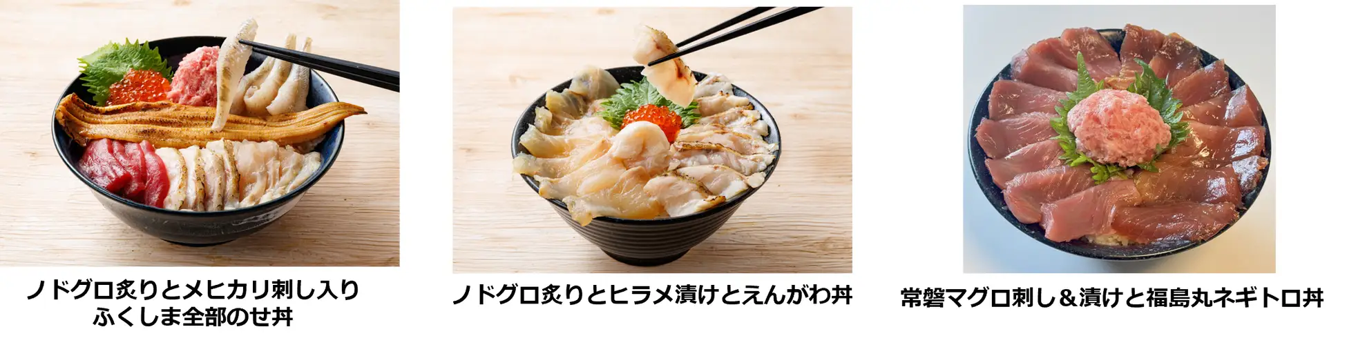 発見!ふくしまお魚まつりの人気ブース「なこそ処 ちょんまげ」では、海鮮丼のネタが充実!福島自慢の魚介をてんこ盛りにした「ノドグロ炙りとメヒカリ刺し入りふくしま全部のせ丼」には、ほとんど地元でしか出回らないメヒカリ刺しと、いわき・小名浜漁港に水揚げされた本マグロの幼魚のメジマグロ刺しの新ネタに、〝白身のトロ〟と呼ばれるノドグロの炙り、「常磐もの」の代表格のヒラメの漬け、脂ののった焼きアナゴ、福島県立小名浜海星高等学校の生徒が練習船「福島丸」で漁獲したマグロのネギトロに、彩りのイクラを添え、全7種類の豪華さです。メヒカリは、唐揚げや干物が定番ですが、地元では刺し身や寿司ネタとしても食されており、水揚げされたばかりの新鮮なメヒカリを一尾ずつ丁寧に切り身にし、急速冷凍して真空パックし新鮮な状態で提供。メジマグロはほどよい脂がのり、すっきりとした味わいが特徴です。ノドグロ炙りとヒラメ漬けに、コリコリとしたヒラメのえんがわを添えた「ノドグロ炙りとヒラメ漬けとえんがわ丼」と、メジマグロ刺しと漬け、ネギトロを盛った「常磐マグロ刺し&漬けと福島丸ネギトロ丼」のリニューアルメニューも登場します。
