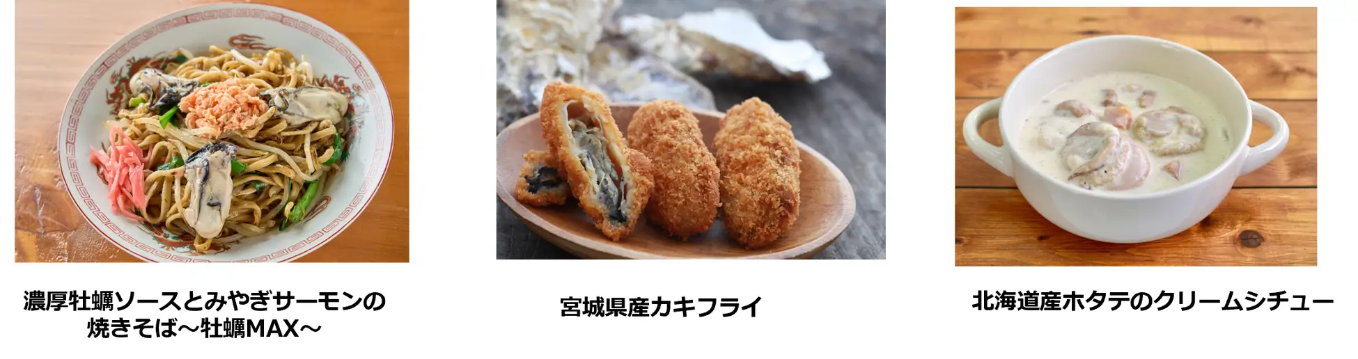 「発見!うまいもの隊」のキッチンカーでは、宮城県や北海道の厳選した魚介を使用したメニューをご用意しています。「濃厚牡蠣ソースとみやぎサーモンの焼きそば~牡蠣MAX~」は、東京・神田の人気ラーメン店「五ノ神水産」が監修したイベント限定メニュー。宮城のブランド養殖ギンザケ「みやぎサーモン」を柔らかく焼き上げ、ソースには宮城県南三陸町のブランド牡蠣「戸倉っこかき」を100%使用しています。宮城・三陸の豊かな海で育った濃厚でジューシーなカキを使った「宮城県産カキフライ」や、北海道のプリプリのホタテを野菜と煮込んだ「北海道産ホタテのクリームシチュー」もどうぞ!