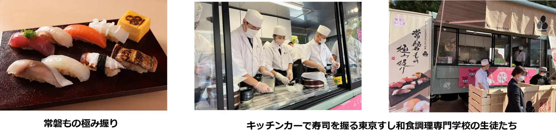 「東京すし和食調理専門学校」が大型キッチンカーで出店し、未来の職人を目指す生徒たちが、来場者の目の前で丁寧に心を込めて握った寿司を提供します。同校は和食に特化した唯一の認可専門学校。70%が実習というカリキュラムで磨いた技を披露。肉厚のヒラメや身の引き締まった寒サワラ、ふっくらと炊き上げたアナゴなど、常磐沖で水揚げされた、この時期が旬の魚を中心に全部で8貫が楽しめます。