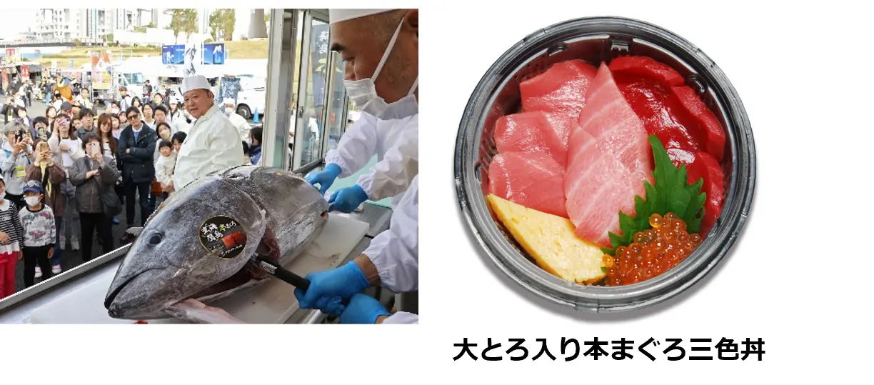 魚のプロの「豊洲かんぺい会」ブースでは、玄界灘の長崎・鷹島で育てられた「生本マグロ」を厳選して直送し、来場者の目の前で「解体ショー」を毎日開催します。さばいたばかりの超新鮮なマグロの味わいは格別です。赤身、中トロ、大トロを食べ比べられる「大とろ入り本まぐろ三色丼」などを提供します。