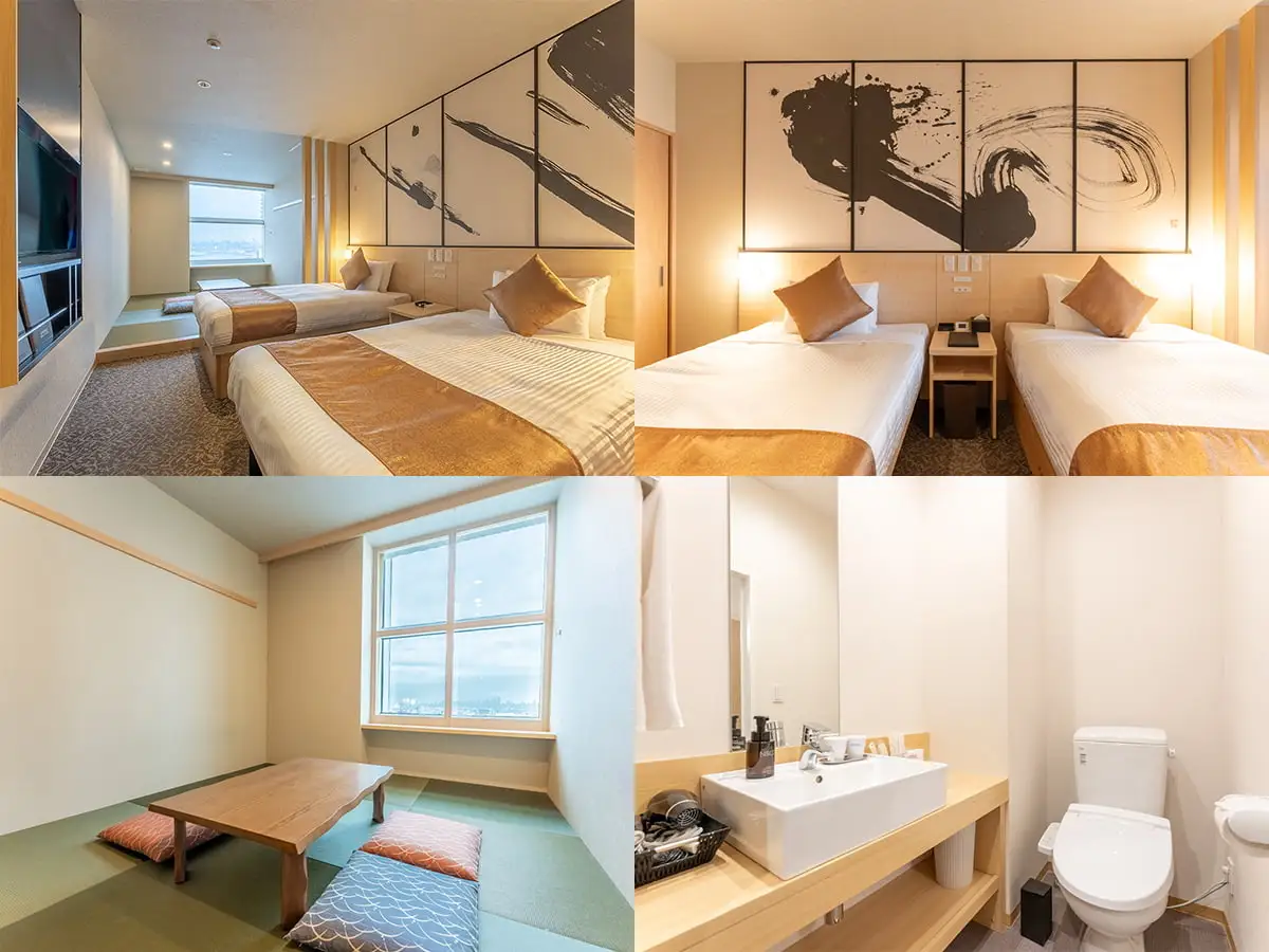 全ての客室が35㎡以上あり最大6名まで宿泊可能で機能性とデザイン性を両立させた和洋室が中心。展望台から見える夜景は日本の夜景百選に選ばれたほどで、階数は違えど全ての客室から関西の夜景を一望できます。