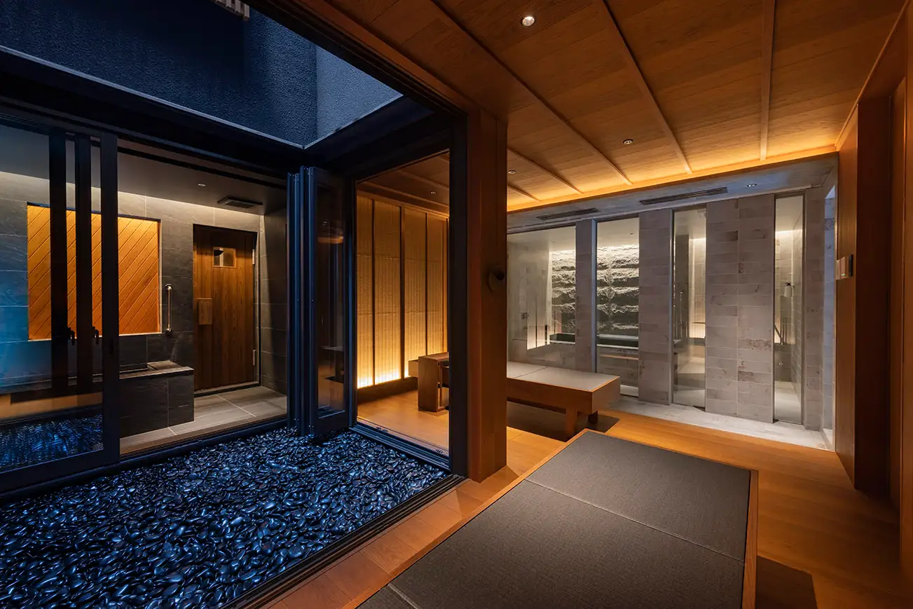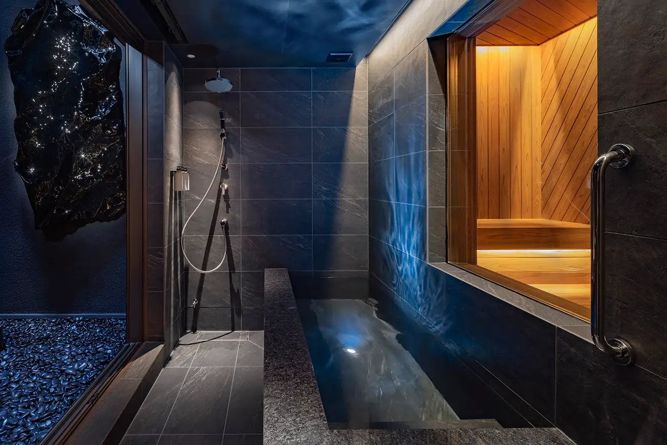 1階フロアをまるごと使用した完全プライベートのサウナ&バスエリア。印象的なアートを配した中庭を中心に、フィンランド式本格サウナとチラー付き水風呂、ヒーリングスペース、4人でも寛ぐことのできる広々とした浴槽をレイアウトし、ご家族、ご友人、カップルでゆったりとお楽しみいただける設計としました。