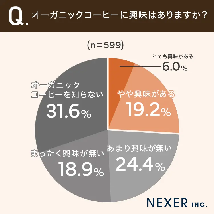 「とても興味がある」が6.0%、「やや興味がある」が19.2%で、合わせて25.2%の方が関心を持っていることがわかりました。一方で「あまり興味がない」が24.4%、「まったく興味がない」が18.9%、「オーガニックコーヒーを知らない」が31.6%という結果でした。