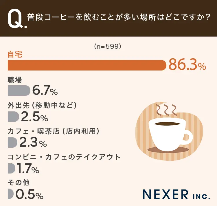 多くの方が、自宅でコーヒーを楽しんでいることがわかります。外よりも落ち着いた場所で、自分のペースで味わいたいと感じている方が多いようです。