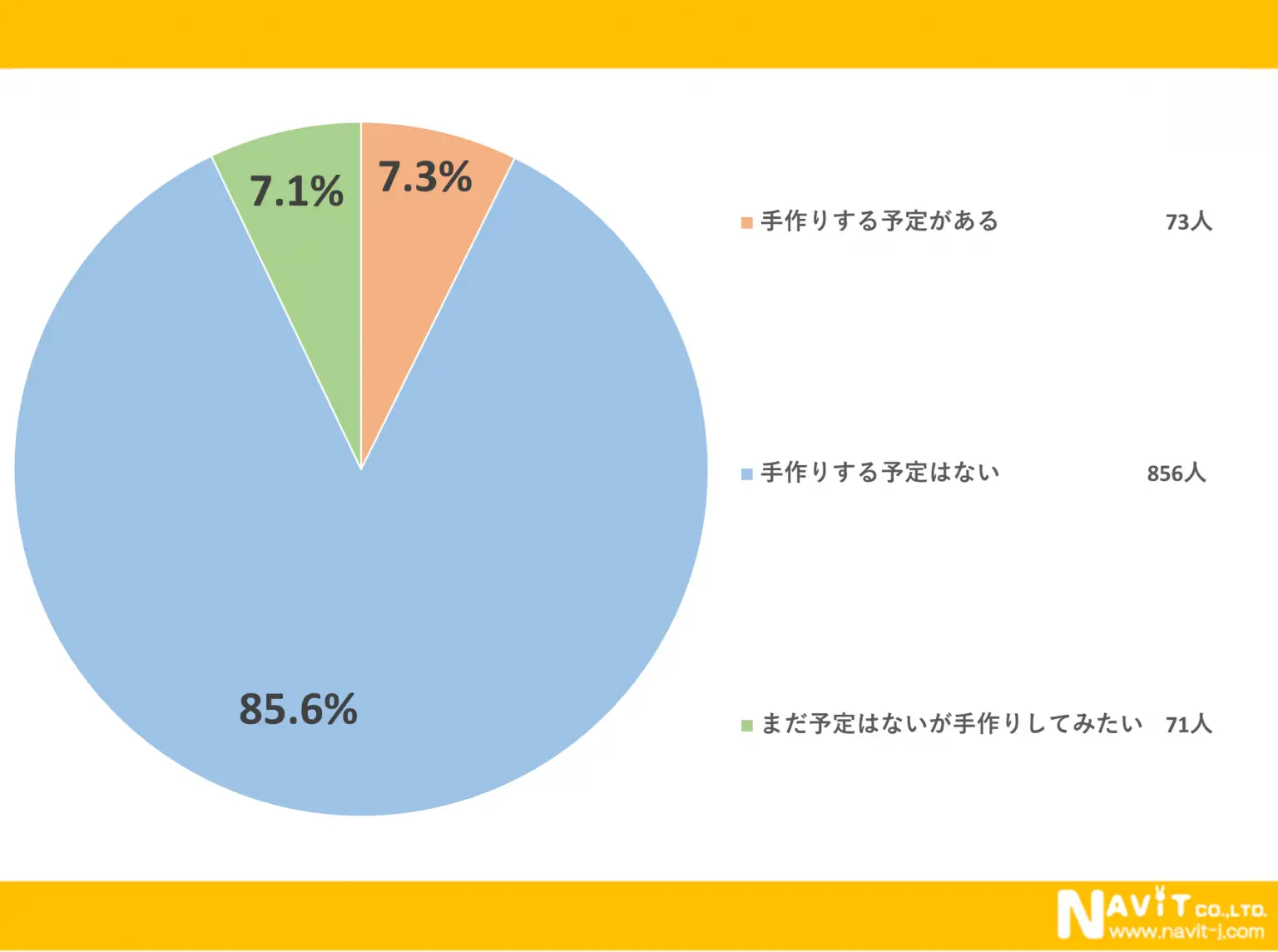 バレンタインにお菓子を手作りしますか?というアンケートでは、「手作りの予定がある」と回答された人は7.3%で「まだ予定はないが手作りしてみたい」と回答された人が7.1%という結果になりました。やはり手作りのお菓子はハードルが高いのでしょう。