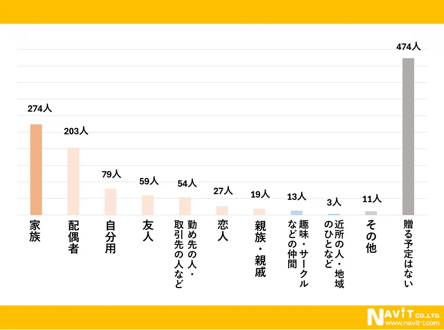 2026年のバレンタインお菓子を贈る人についてのアンケートを複数回答でいただきました。一番多かったのが「家族」で274人、次に多かったのが「配偶者」で203人で「自分用」と回答された人が79人と続きました。