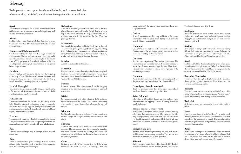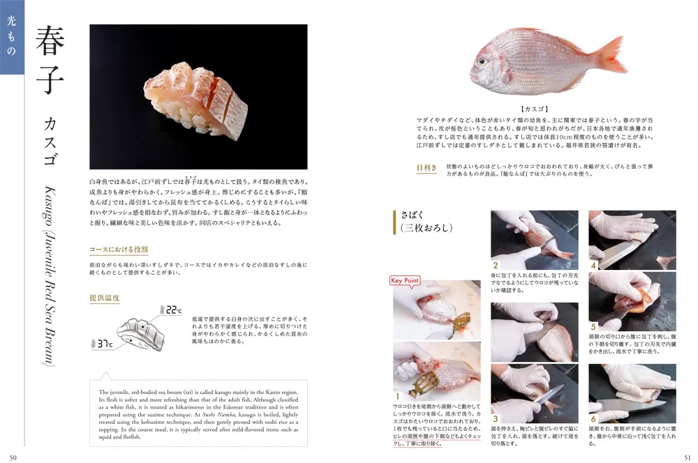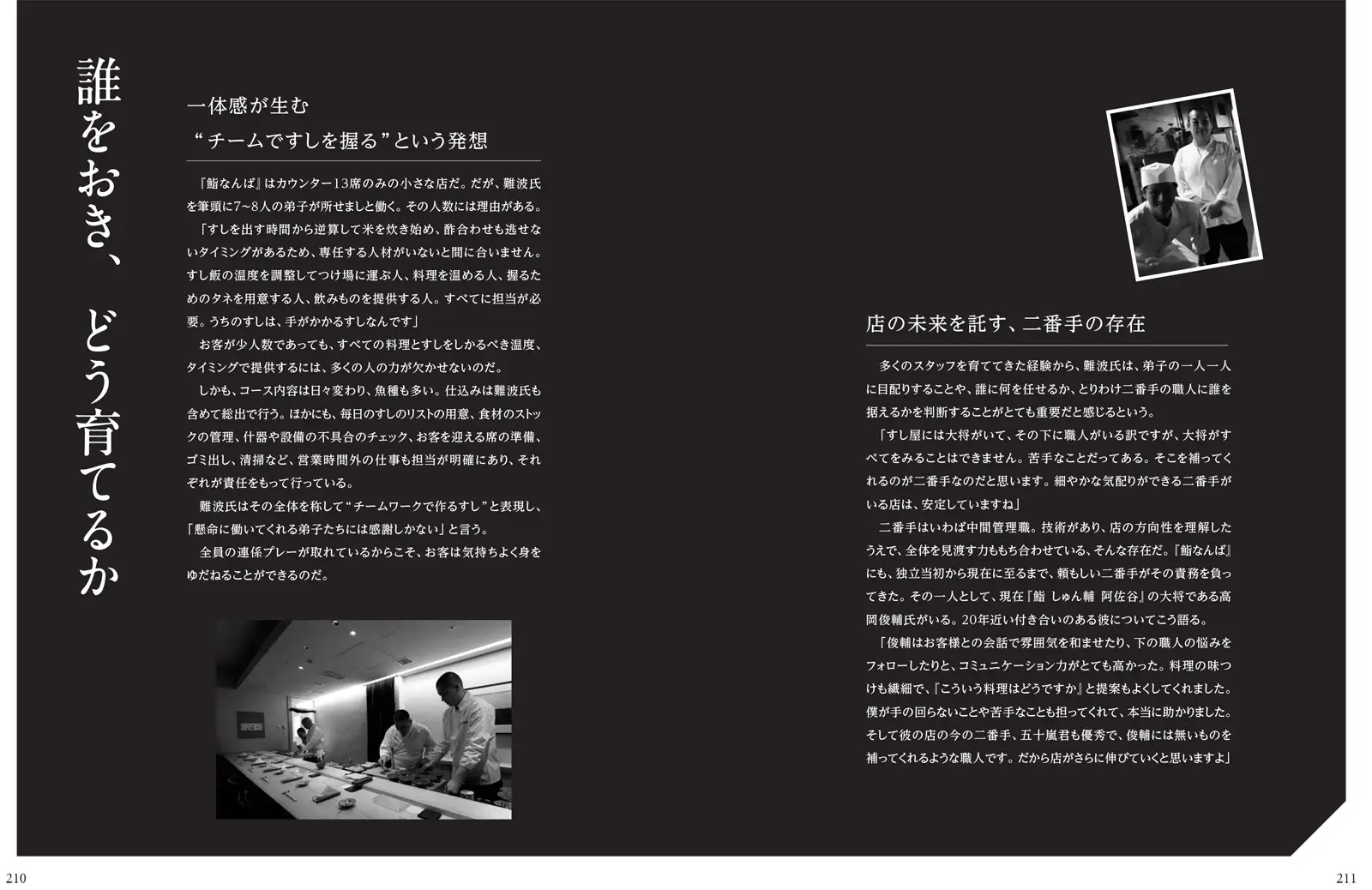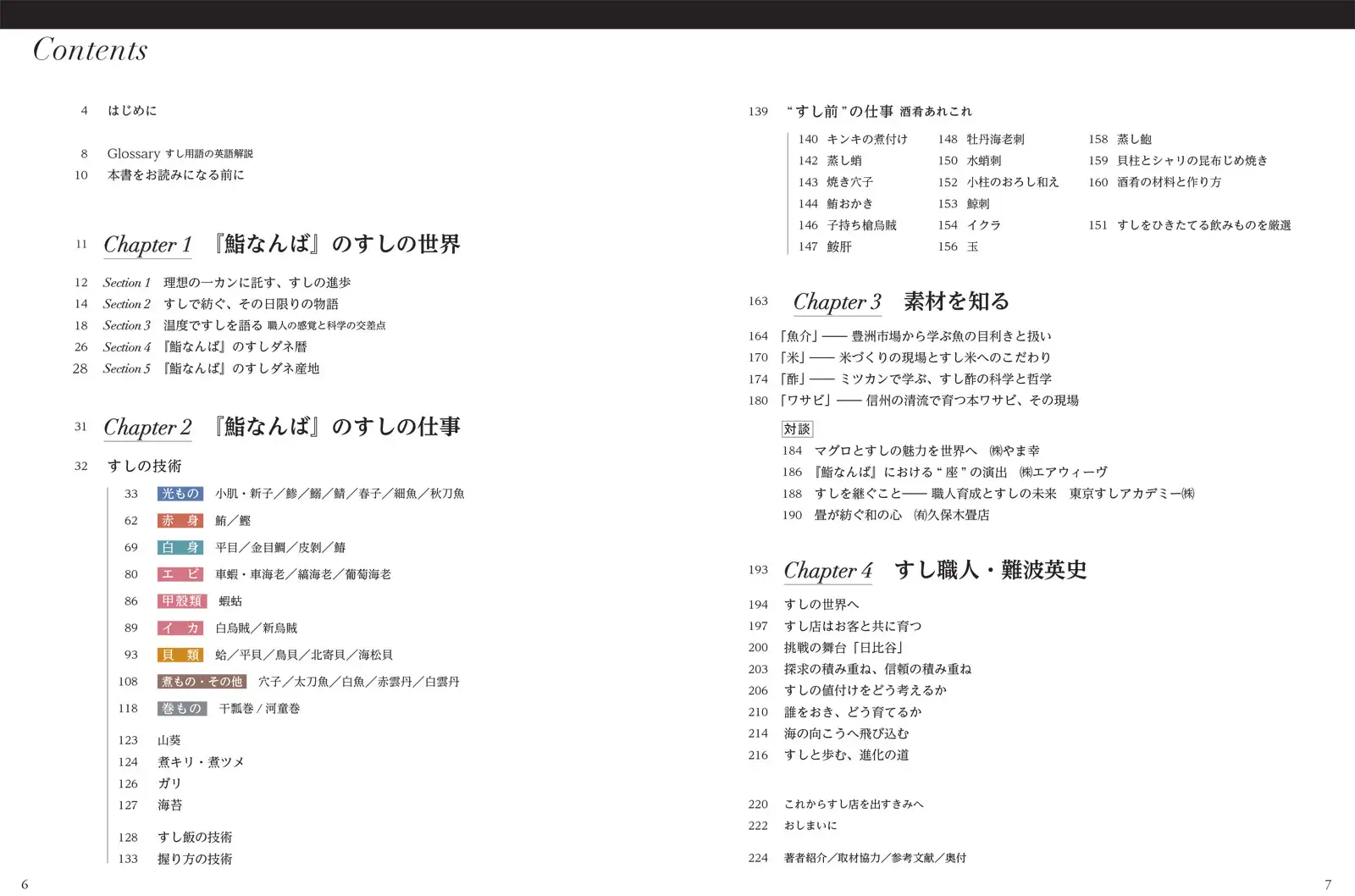 本書では、難波氏の代名詞である「温度に基づいた握りの最適化」を中心に、すしダネの仕込み、握りの技術、酒肴、コース構成、素材の選び方まで、現代の職人に必要な理論と実務を幅広く紹介しています。