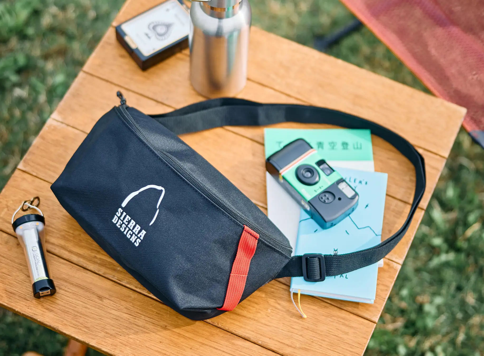 マウンテンパーカの元祖ブランド、シエラデザインズとコラボした、キャンプやお散歩に最適なボディーバッグ。500mlペットボトル2本入る大容量と多彩なポケットがうれしい。