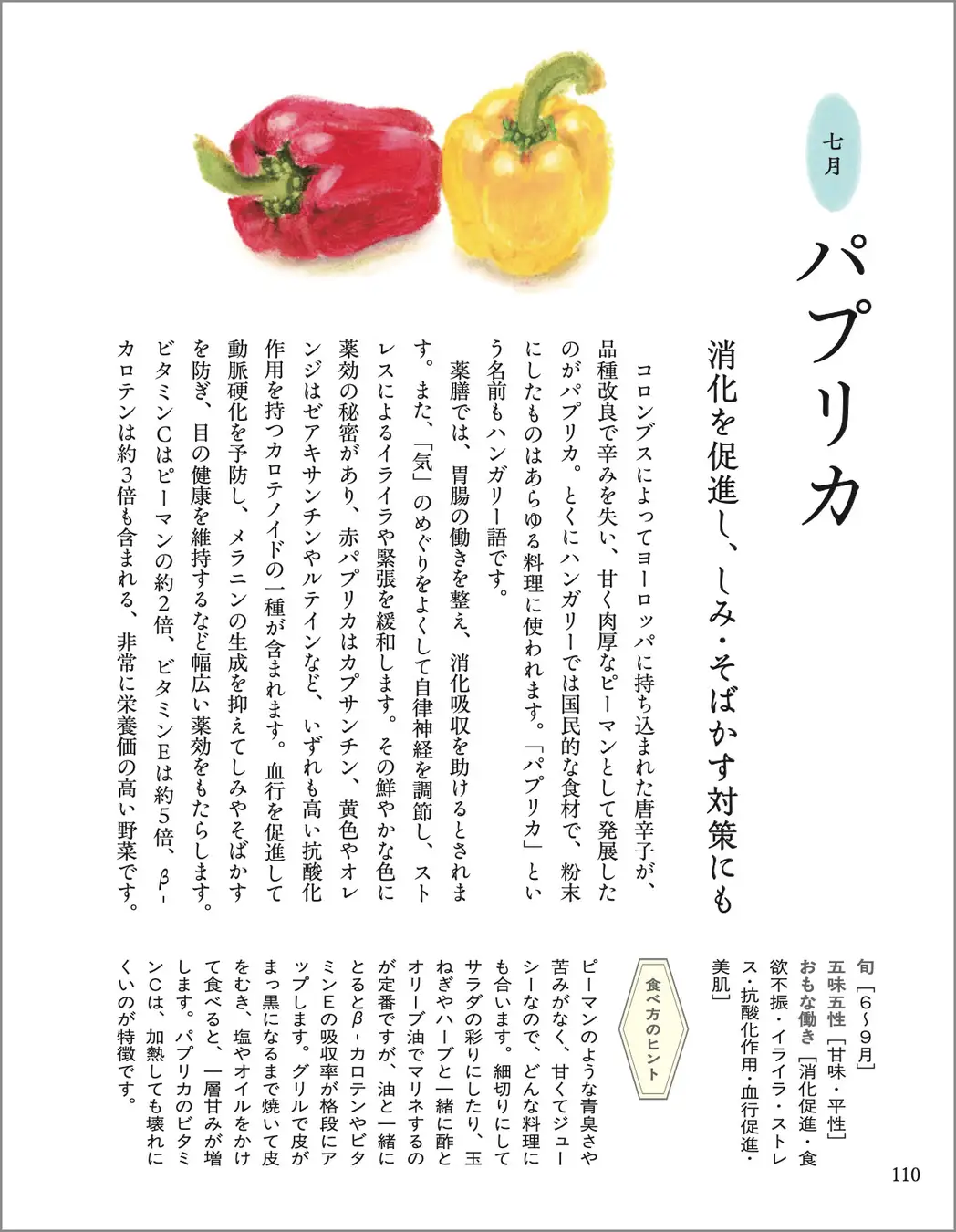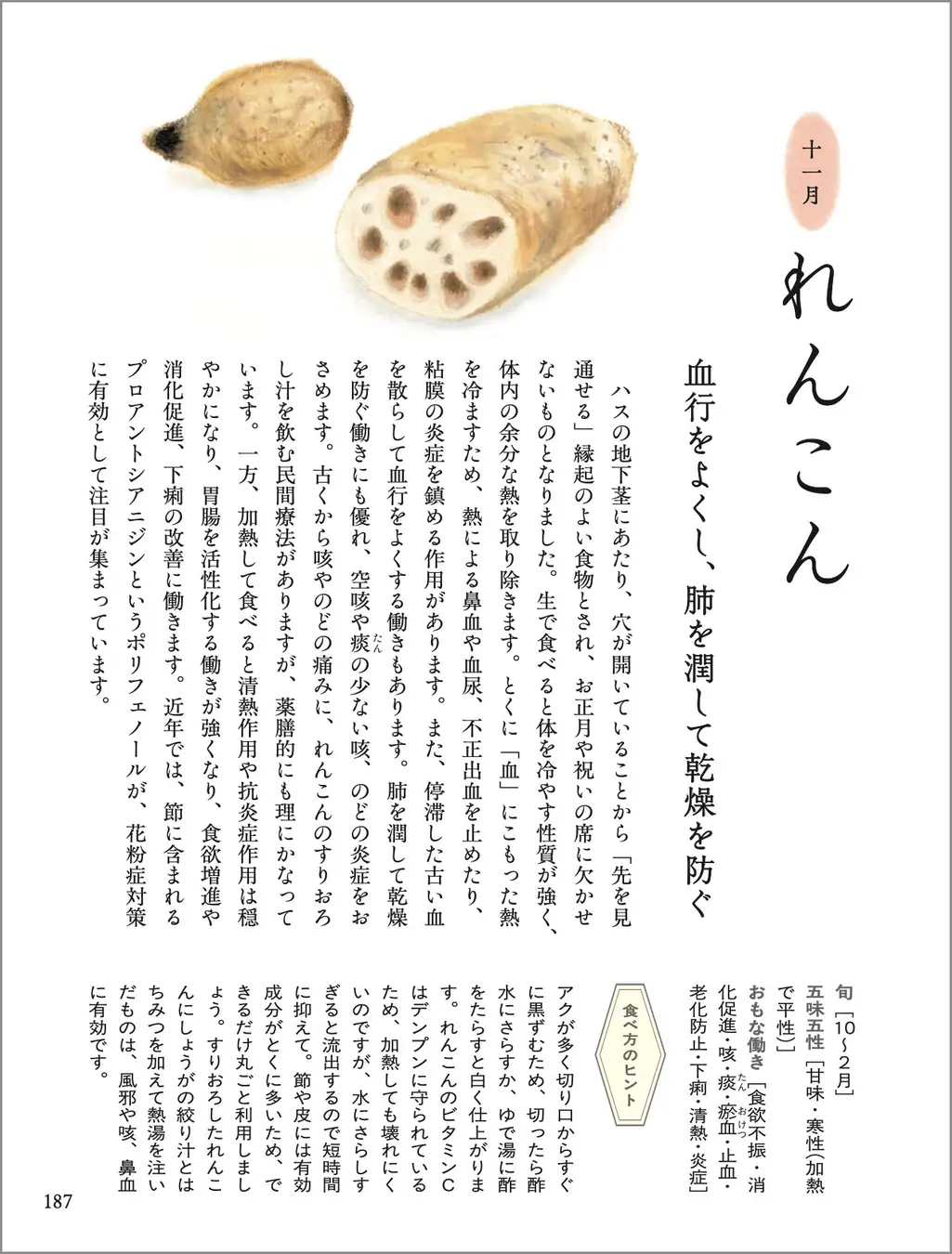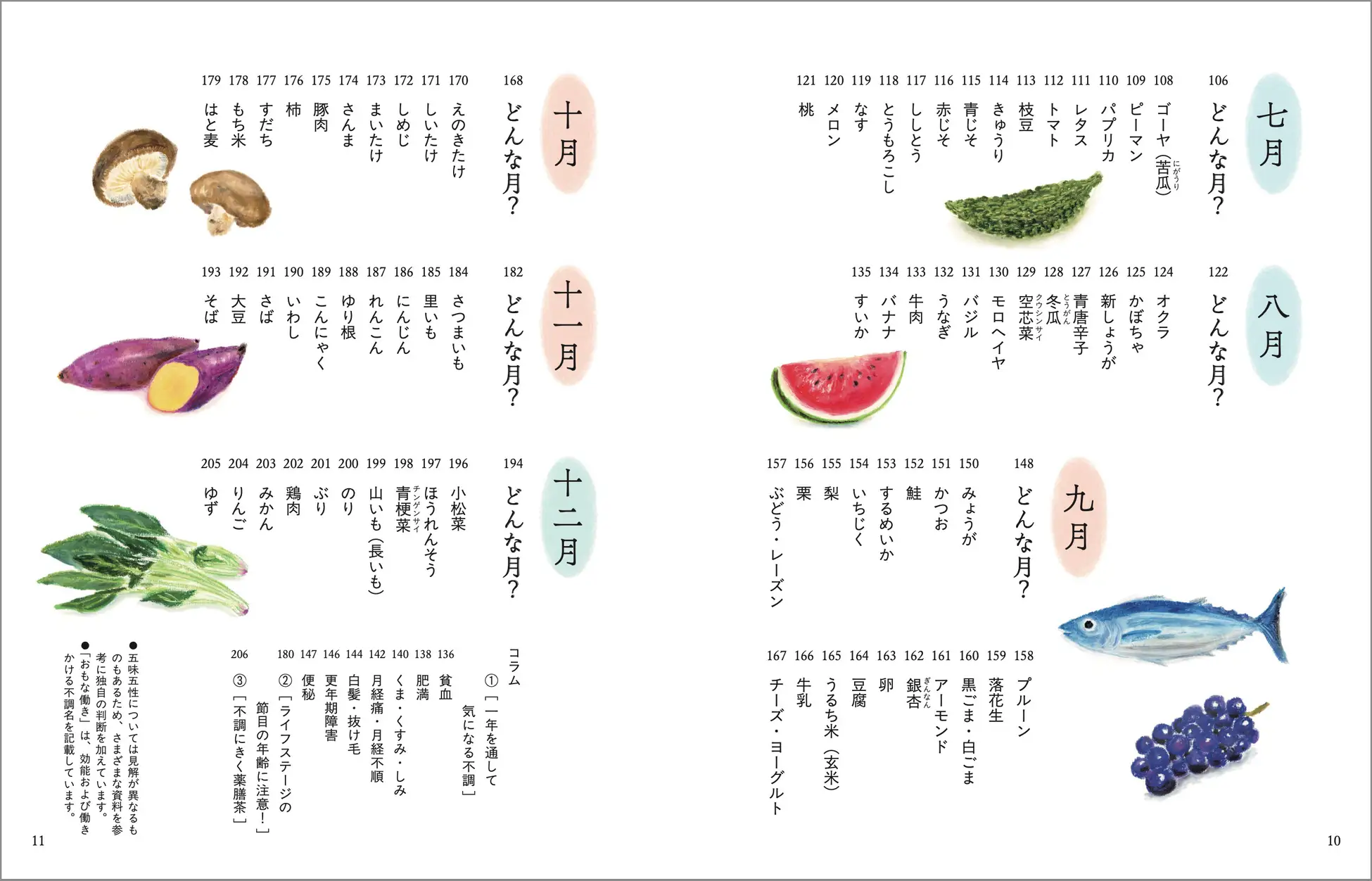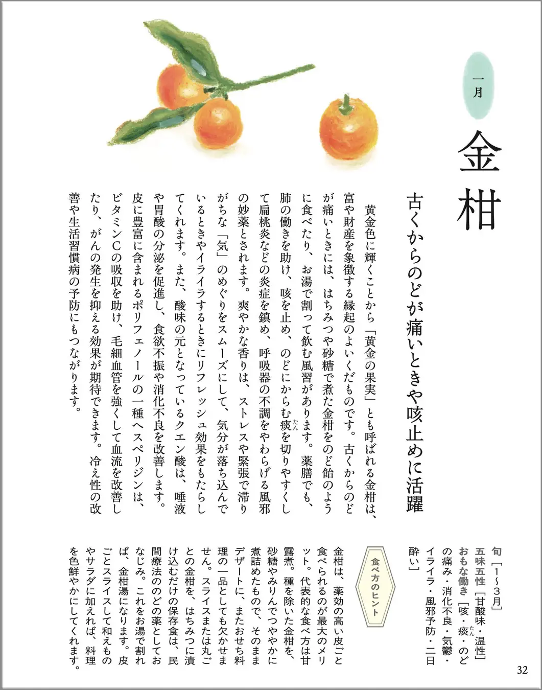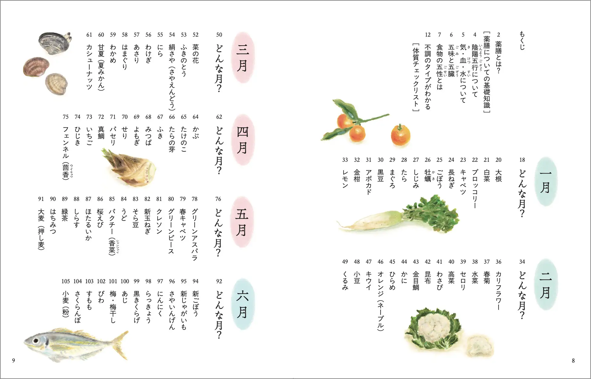 寒さで免疫力が下がる1月、血行が悪くなり「気」の巡りも悪くなって精神的に落ち込みやすくなる2月、梅雨時期の湿気で頭痛がする6月…。そうした月ごとの「気になる不調」と、それをやわらげてくれる食材、およびその食べ方のヒントについて解説。全編イラストでながめるだけでも癒される1冊です。
