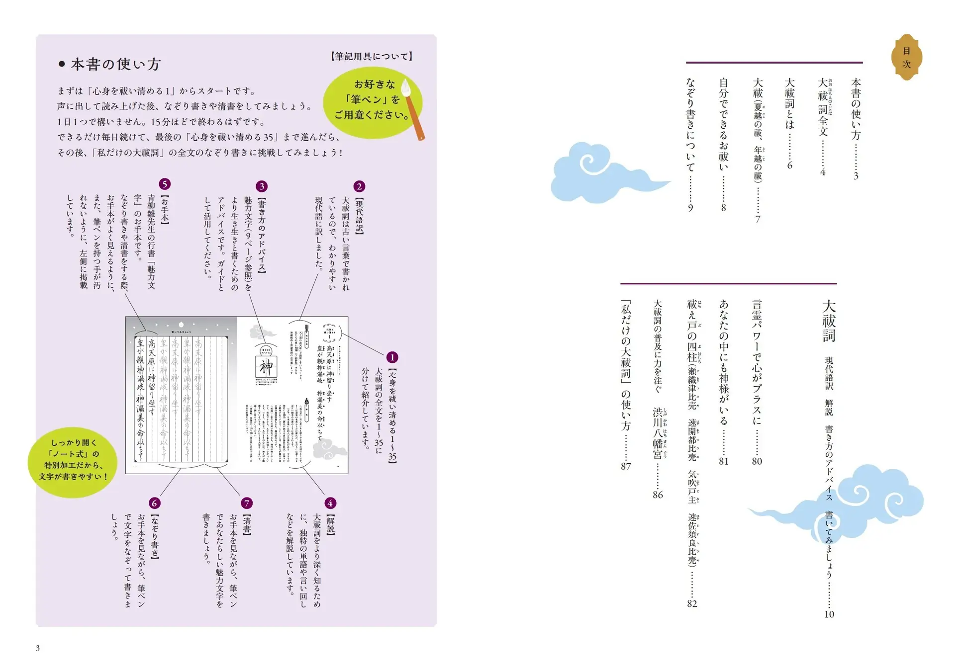 また巻末には、清書としての「私だけの大祓詞」を掲載しています。本書から切り離して、飾ったりバッグに入れて持ち歩いたり。心を払いたくなったときにすぐ開き、お祓いに活用ください。