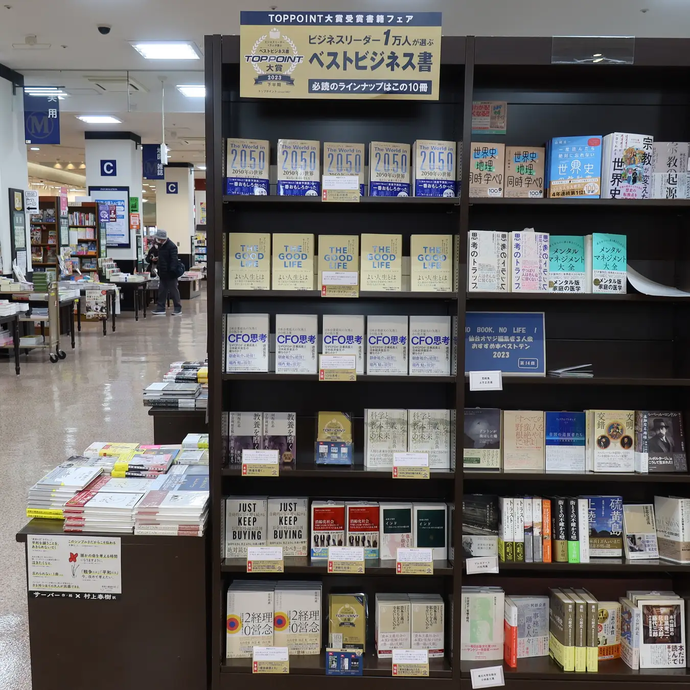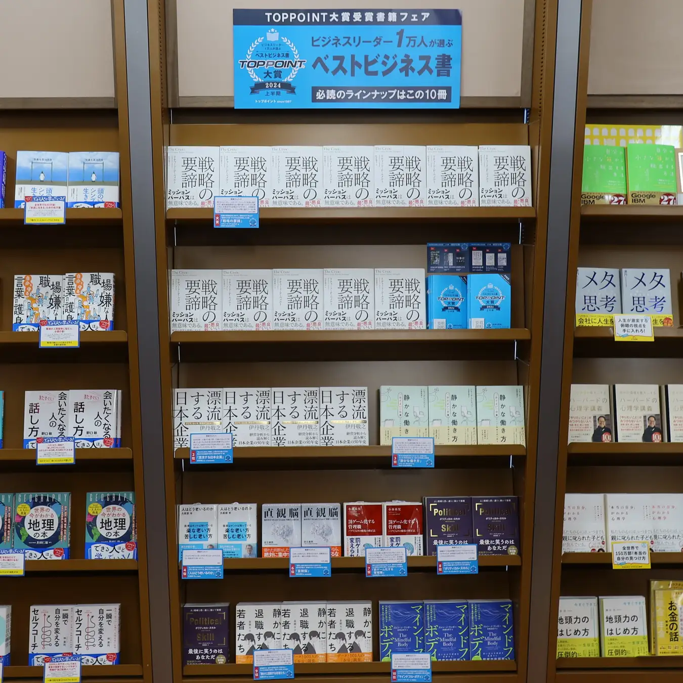 本賞の決定に伴い、丸善ジュンク堂書店、文教堂、有隣堂及び未来屋書店の主要大型店約50店舗にて「TOPPOINT大賞受賞書籍フェア」を開催します。開催期間は、2月1日(日)より1カ月間の予定です。