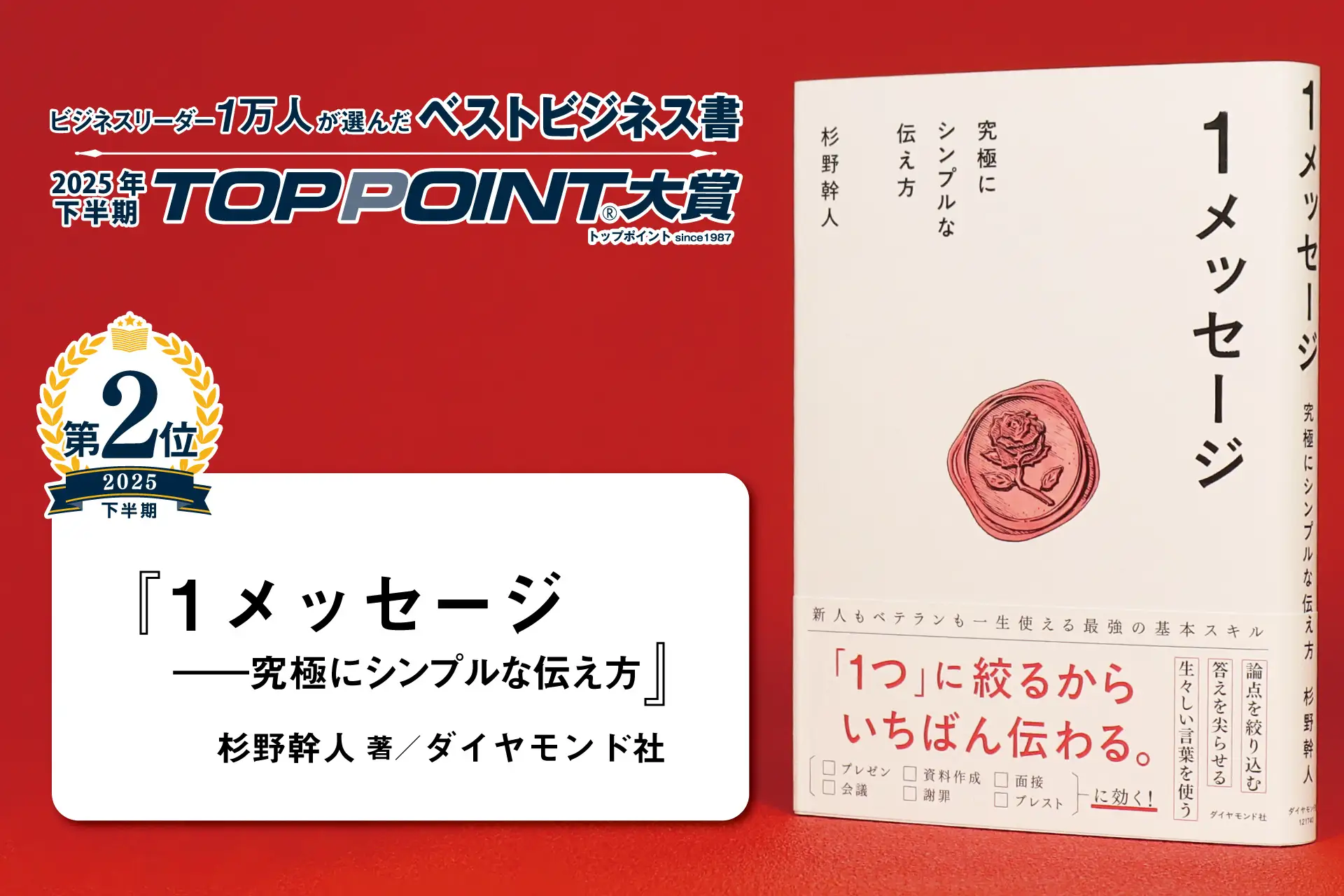 第2位に選ばれたのは、『1メッセージ ――究極にシンプルな伝え方』(杉野幹人 著/ダイヤモンド社)です。元コンサルタントで、現在は武蔵野大学大学院教授の著者は言います。「『結果を出す人』は1行にすべてを込める」。本書は会議や面接など、様々な場面で効果を発揮する「1メッセージ」の極意を伝授します。