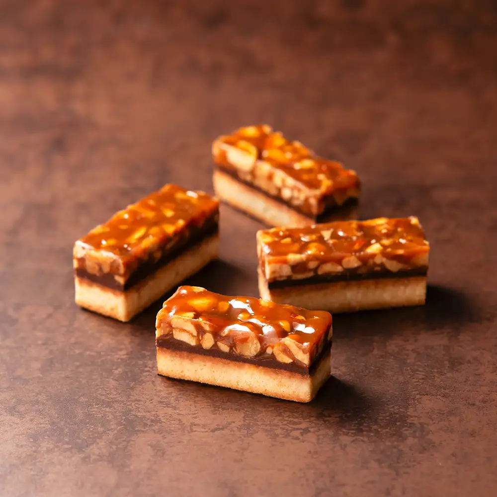 ほろっとほどける食感とバターが香り立つ厚焼きのショートブレッド。奥行きのある味わいを引き出すチョコレートクリーム。アーモンド、くるみ、カシューナッツ、3種のナッツを合わせて煮詰めた歯切れの良い華やかな甘味のキャラメル。三層の異なる味わいと食感を重ねました。