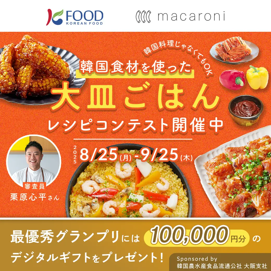 株式会社トラストリッジ(本社:東京都目黒区、代表取締役社長 大場 義之)が運営する、食と暮らしのメディア「macaroni(マカロニ)」と韓国農水産食品流通公社大阪支社(大阪府大阪市)は、韓国料理の日本の食卓での一層の普及を目指し、レシピコンテストを開催しています。