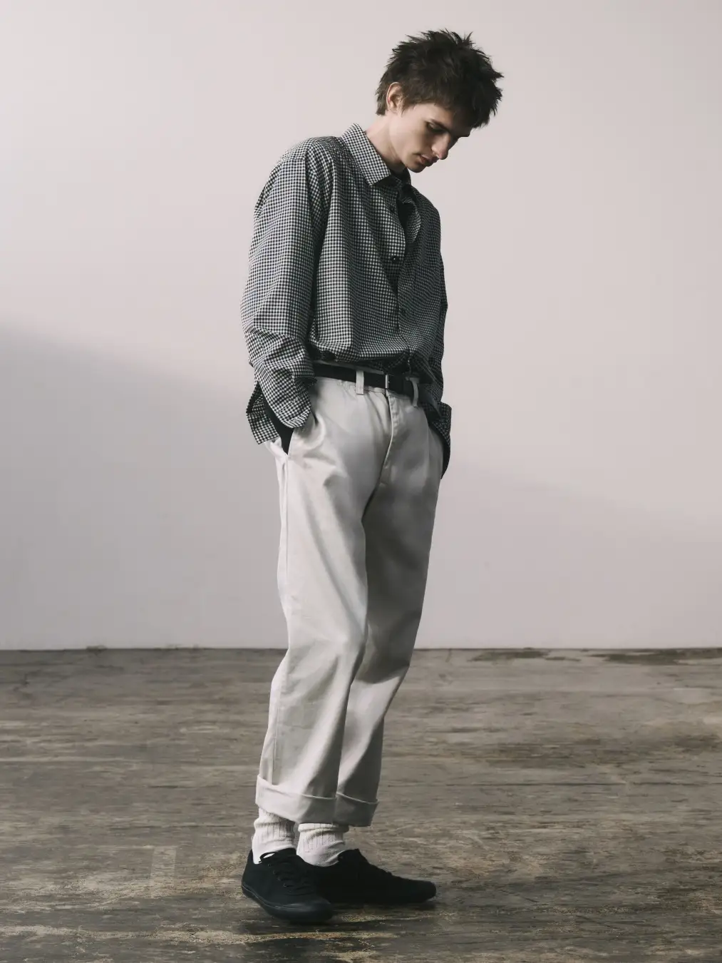 チノトラウザーズには、滑らかな光沢と柔らかさを加えた糸を使用し、ラフでありながらキャラクタのある素材を開発。仕上げにバイオウォッシュ加工を施すことにより、あたり感が出て、自然に馴染んだ風合いと色合いが生まれました。