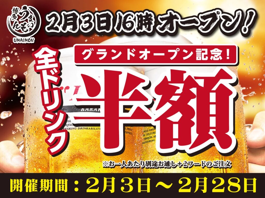 【オープン記念で2月末まで全ドリンク半額キャンペーン開催】「博多 うまいもん」が2026年2月3日(火)16時にグランドオープン!