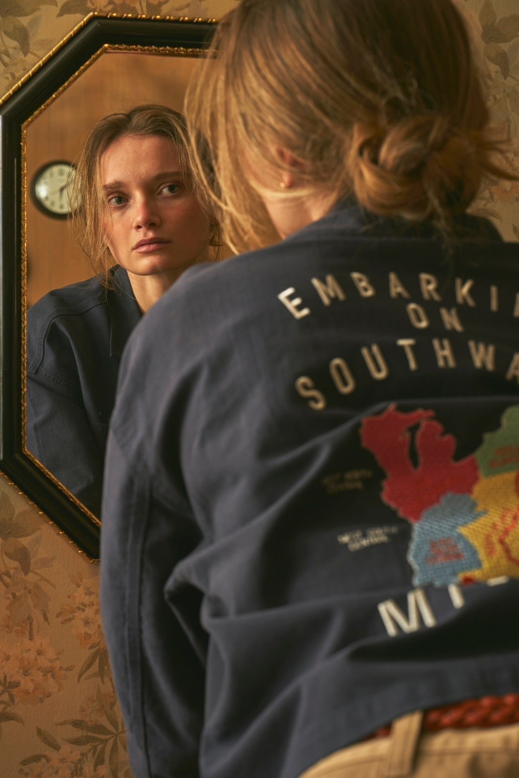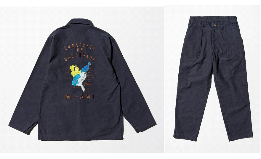どちらもジャケットのバックスタイルには、AVIREXの2024年春夏シーズンテーマである「EMBARKING ON SOUTHWARD」になぞらえた、地図に記されたNYからFloridaへと続くロードマップを記したデザインを、ベトジャン風の刺繍で表現。