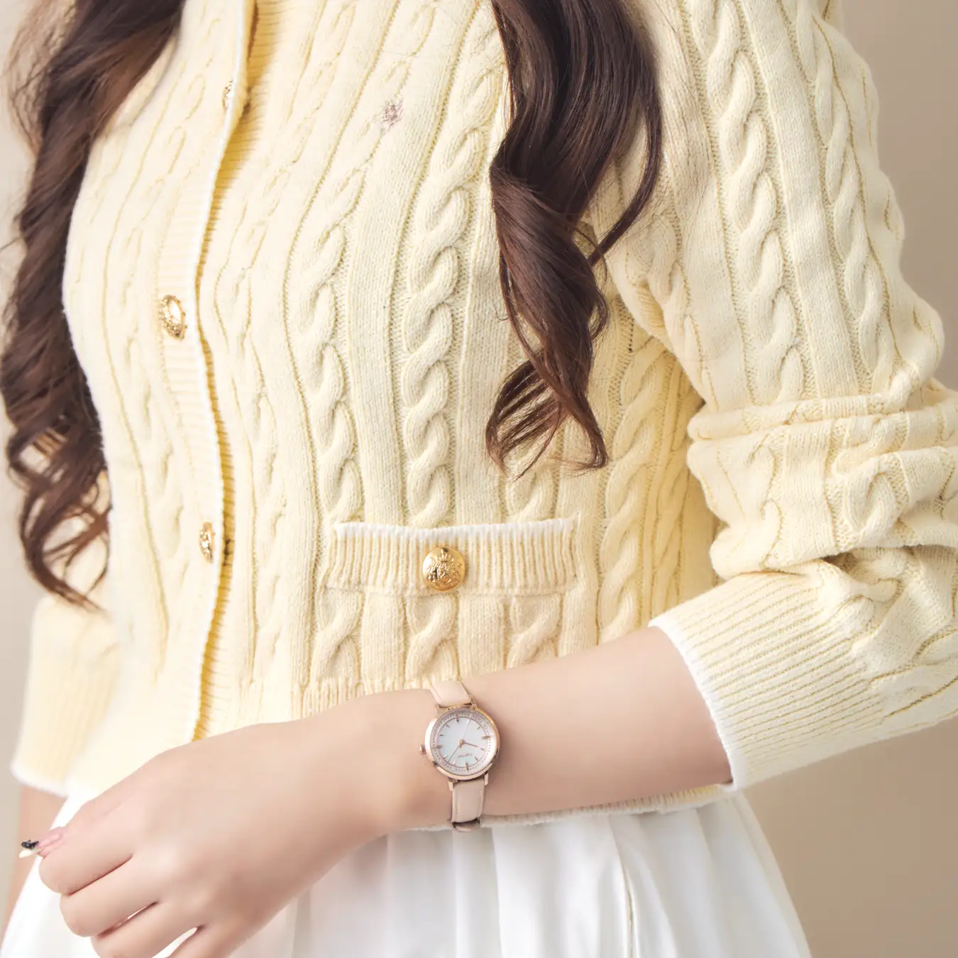 肌にすっと溶け込むようなピンクベージュのレザーベルトが、手元をやさしく明るく見せてくれるモデル。甘くなりすぎない絶妙な色合いで、フェミニンさと上品さをバランスよく両立しました。インデックスまわりにあしらわれたクリスタルが、控えめながらも女性らしい華やかさをプラス。普段使いはもちろん、少し特別な日にも自然に寄り添う、万能な一本です。
