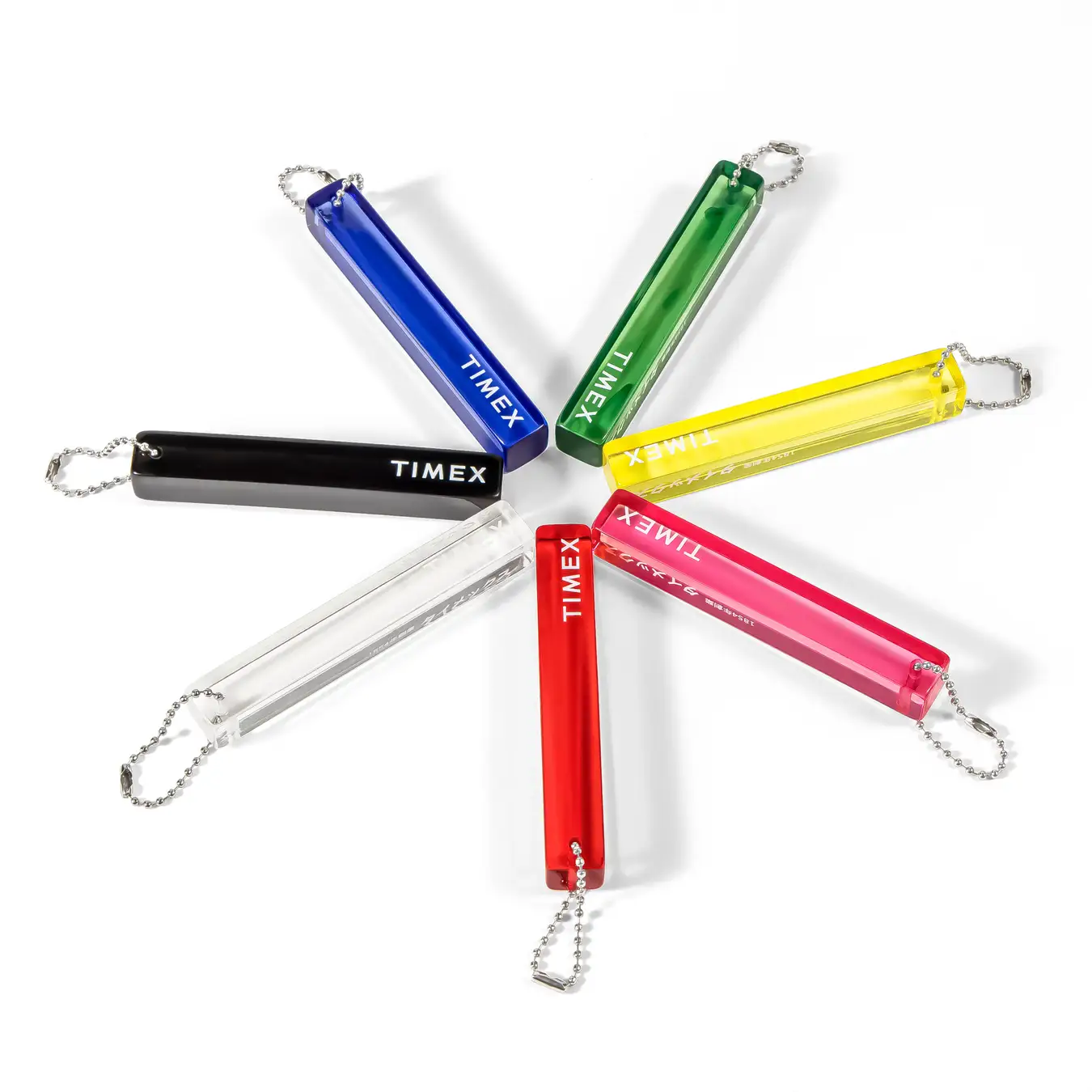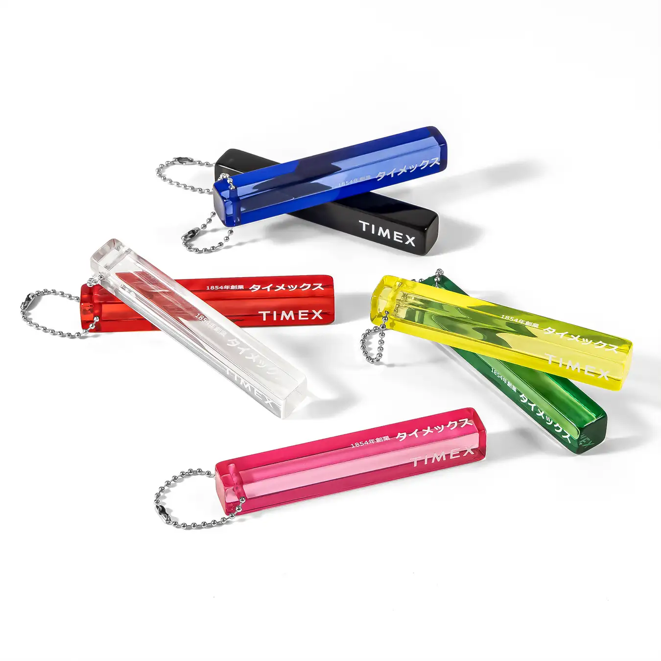 どこか懐かしくも新しい、レトロモダンなアクリル製キーホルダーです。クリア仕様のボディには、お馴染みの「TIMEX」ロゴに加え、非常に珍しいカタカナの「タイメックス」ロゴを配置。全7色の鮮やかなカラーバリエーションで展開します。