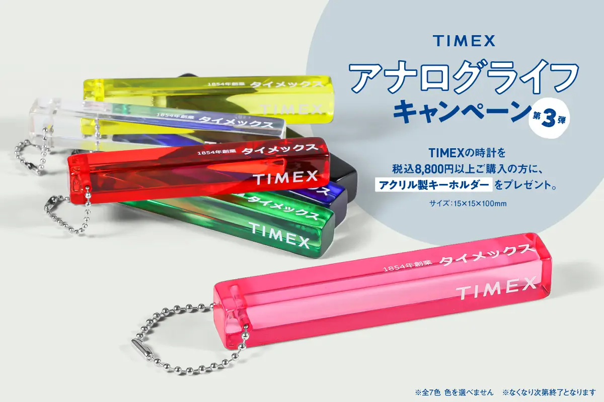 アメリカの時計ブランド『TIMEX<タイメックス>』、時間を立ち止まって楽しむ「アナログライフキャンペーン第3弾」!本国スタッフ絶賛のカタカナロゴが秀逸なアクリル製キーホルダーをプレンゼント!