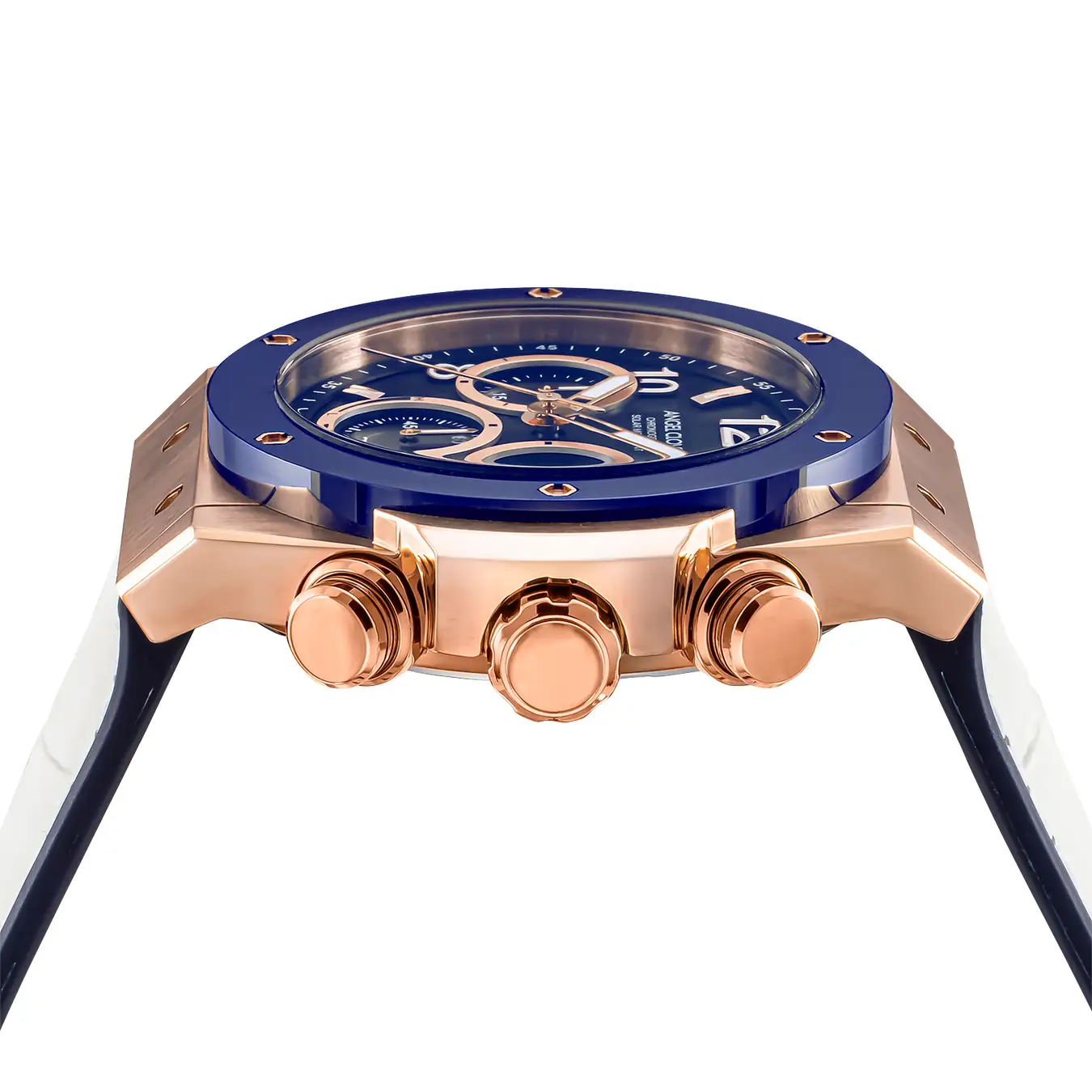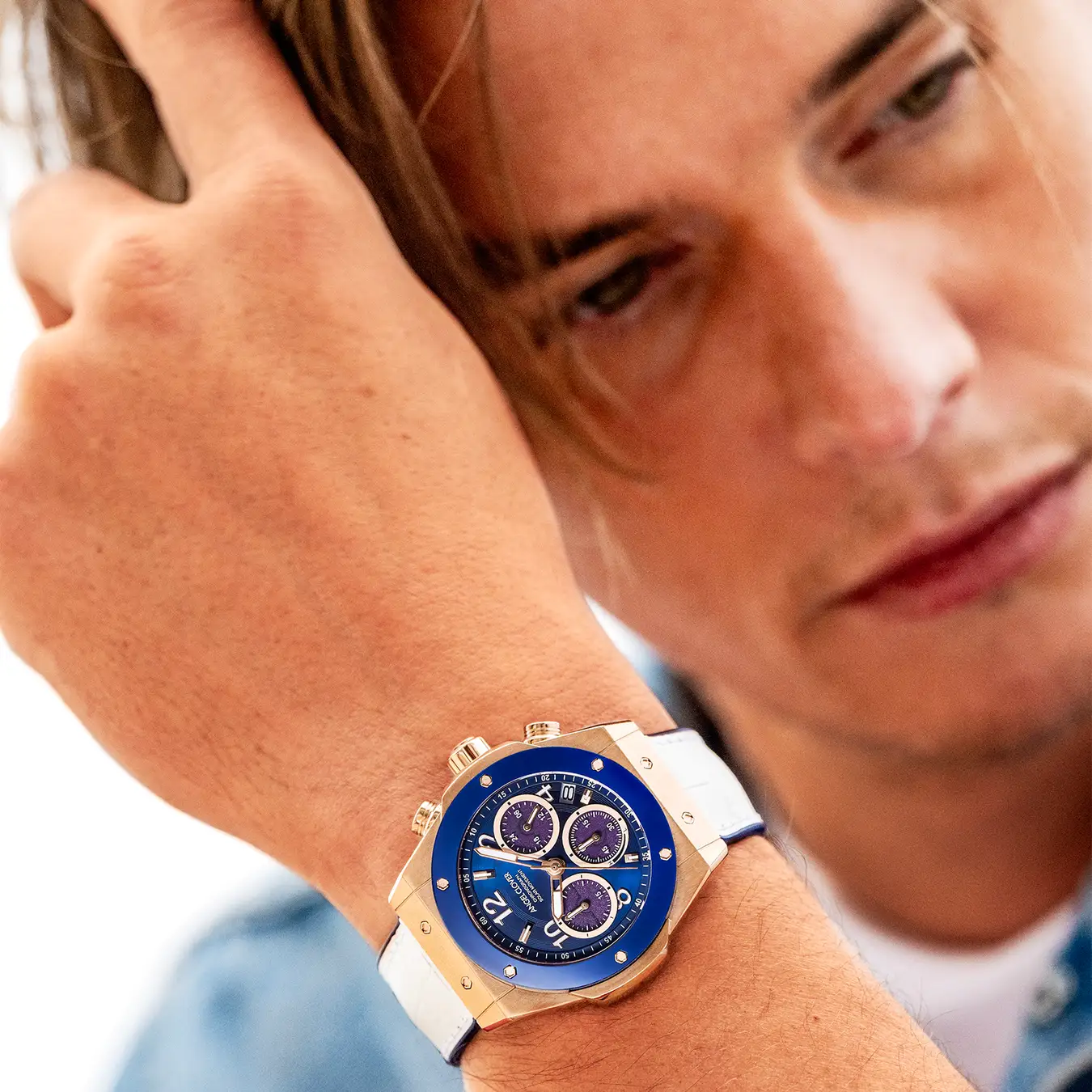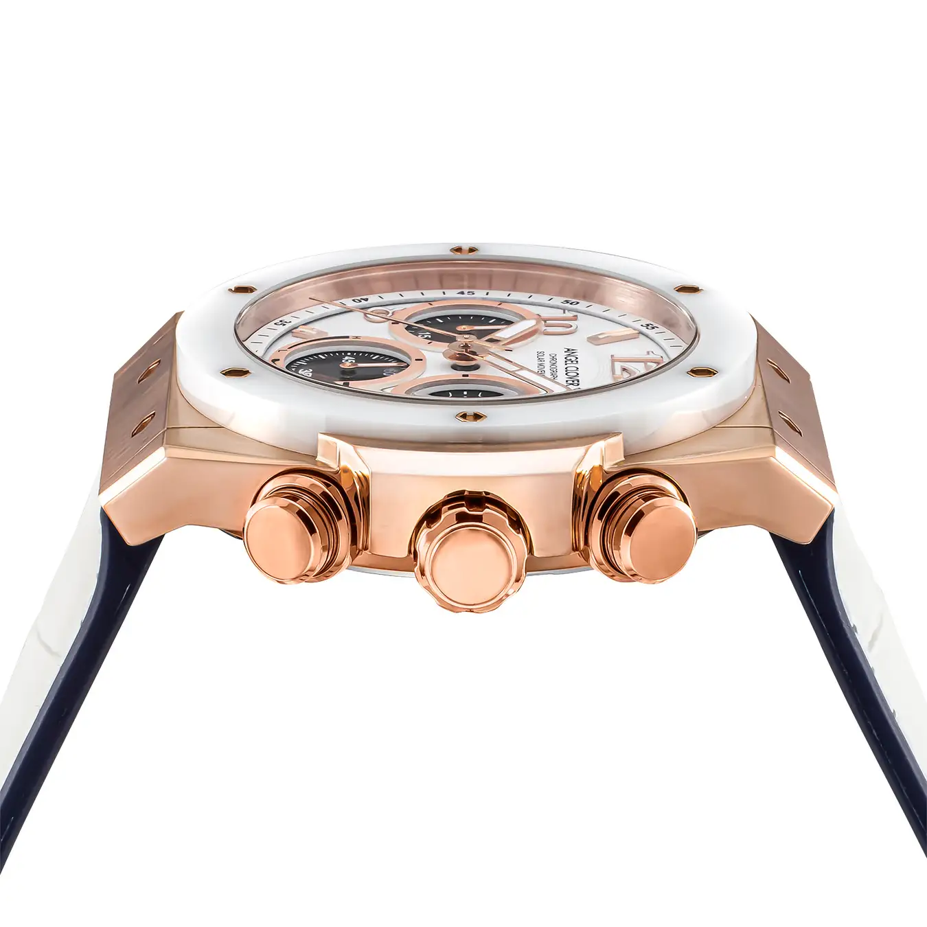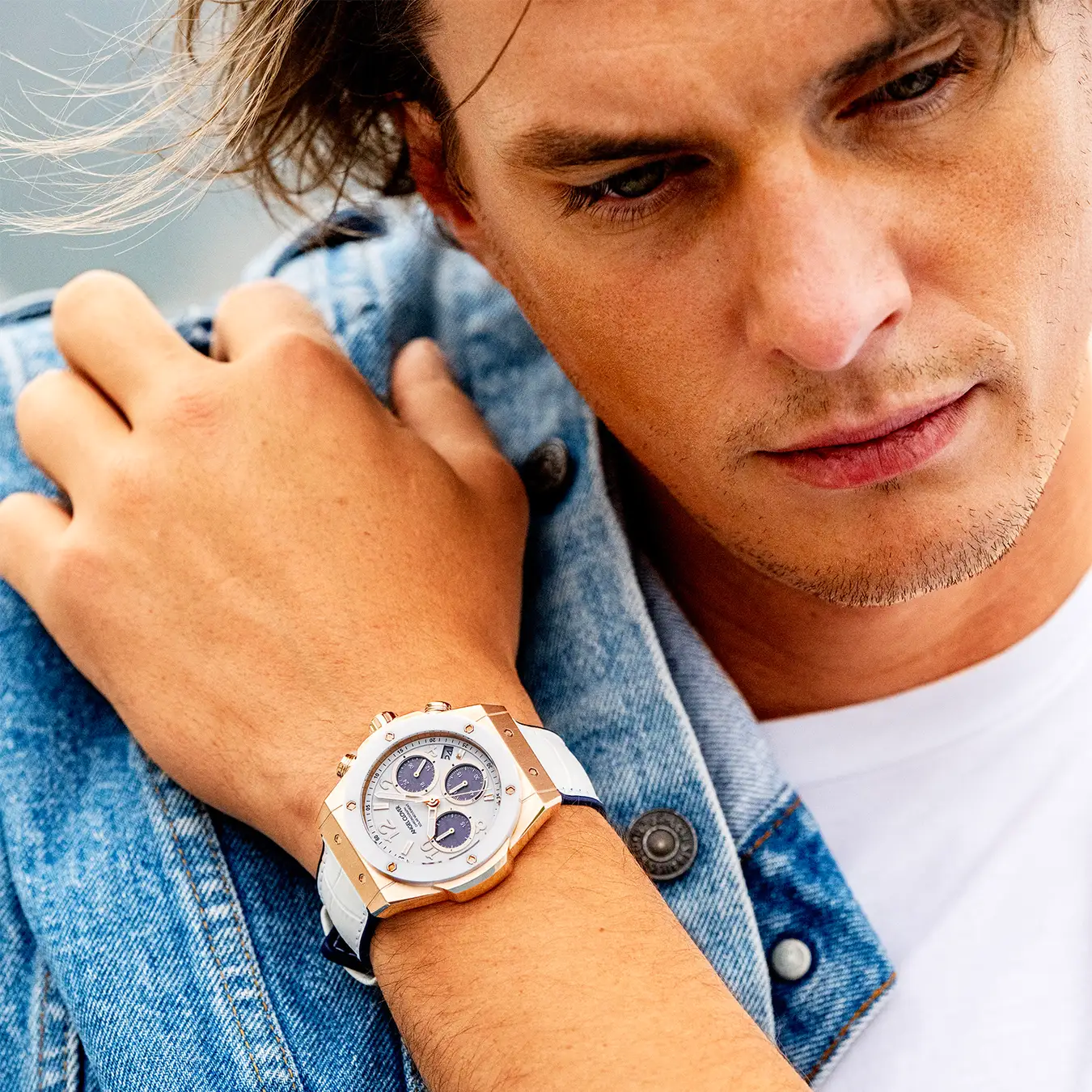 艶やかな光沢を放つセラミックベゼルを採用。スポーティなクロノグラフデザインに上品なアクセントを加え、腕元にラグジュアリーな存在感を演出します。