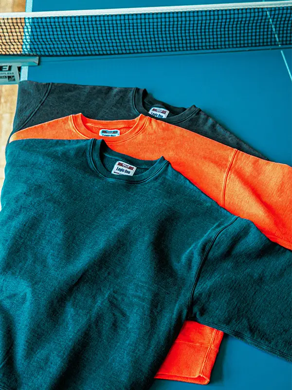 アーティストたちが好んで愛用したアメリカ90’sのスウェットのディテールや雰囲気にインスピレーションを得ながら、国内工場で編んだタフな裏毛生地を用いて丁寧に現代のシルエットに落とし込みました。
