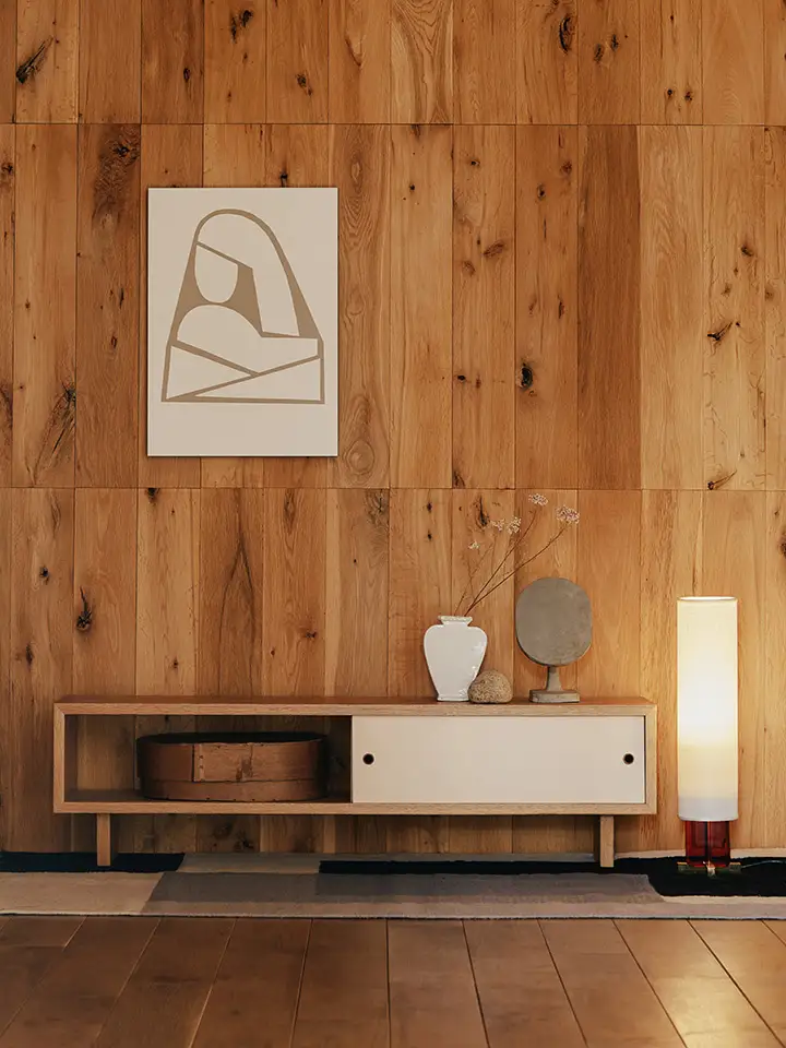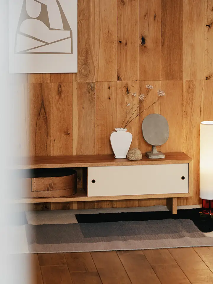 grafのアイコン的家具でもある「Bau Dana」。建具に開いた丸穴の引き手がアクセントになった、シンプルなラインで構成されたデザインです。