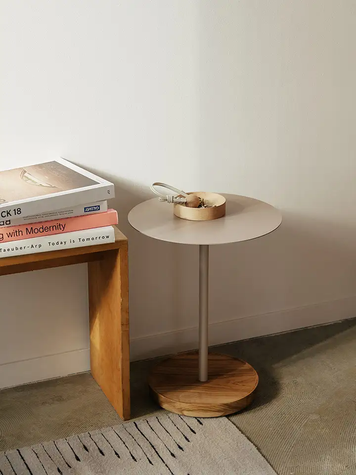 薄い天板と木のトレーの組み合わせが特徴的なサイドテーブル。スチール材の天板と支柱は薄く細くシャープに。シンプルな印象ながらも、無垢材の木の表情があることで様々な素材やスタイルの家具とも幅広く合わせやすいデザインです。