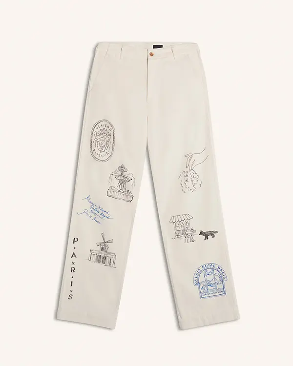 パリのランドマークから着想を得た手描きのポストカードモチーフを施したワークジャケットとセットアップのトラウザー。旅の思い出を身にまとうようなデザインです。