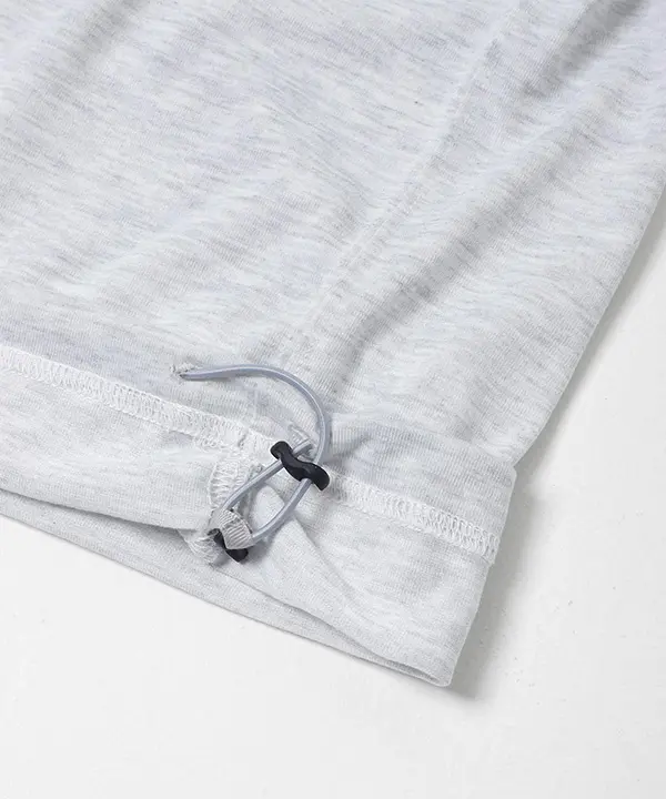 裾にはゴムスピンドルを備え、シルエットやフィット感を調整することが可能です。絞ることで立体的なフォルムを作り、スタイリングの変化も楽しめます。