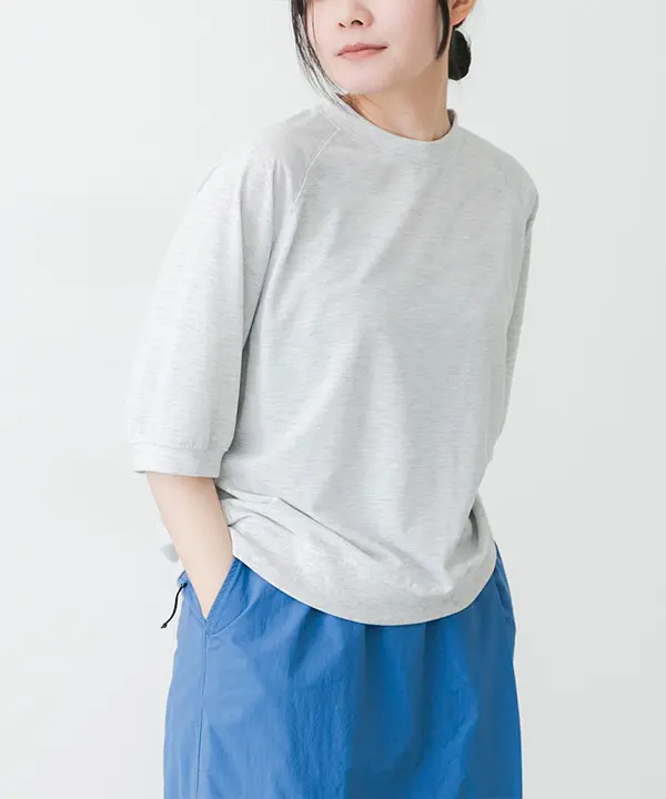 コットンライクな自然な風合いを持ちながら、特殊な異形断面糸により繊維の表面積を広げ、汗を素早く吸収・拡散し乾きやすい構造を実現した素材で、蒸し暑い夏の環境でも快適な着用感を保ちます。