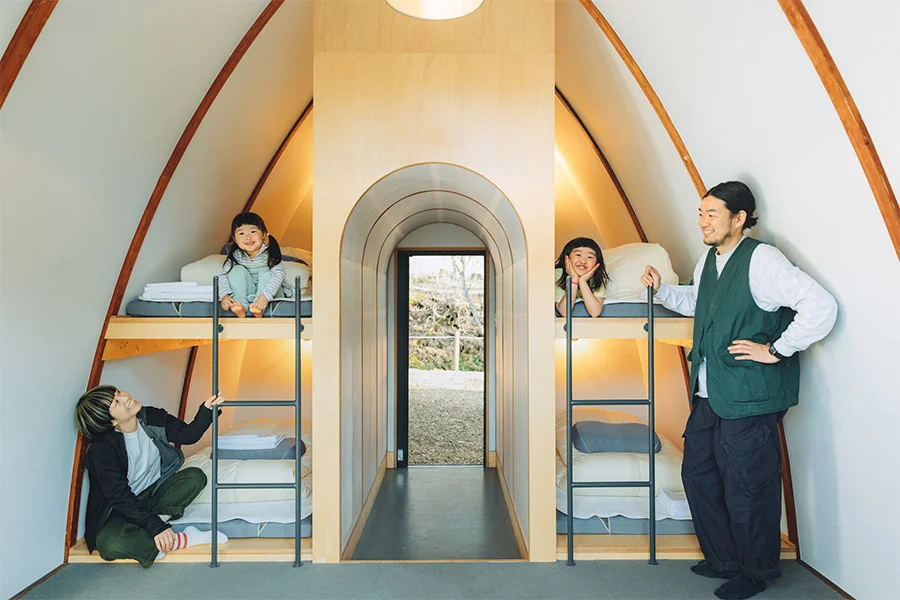 キャンプ場を取り囲むように立ち並ぶ24棟のシンプルな宿泊小屋キャビン。今回ご紹介するコンフォートBタイプは2段ベッドが配置され、カプセル仕様のベッドスペースが用意された空間にリノベーションされています。目の前の芝生エリアにはテントやタープを張っていただくことも可能なので、アウトドアステイにオススメです。