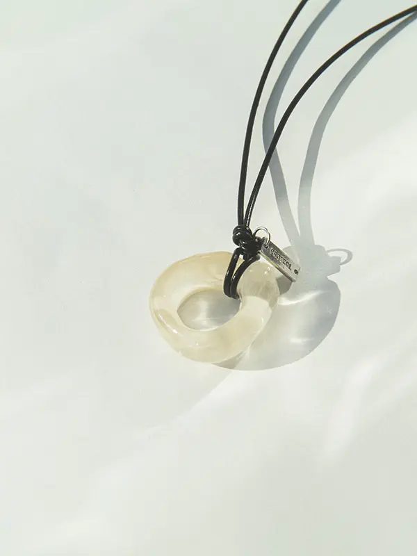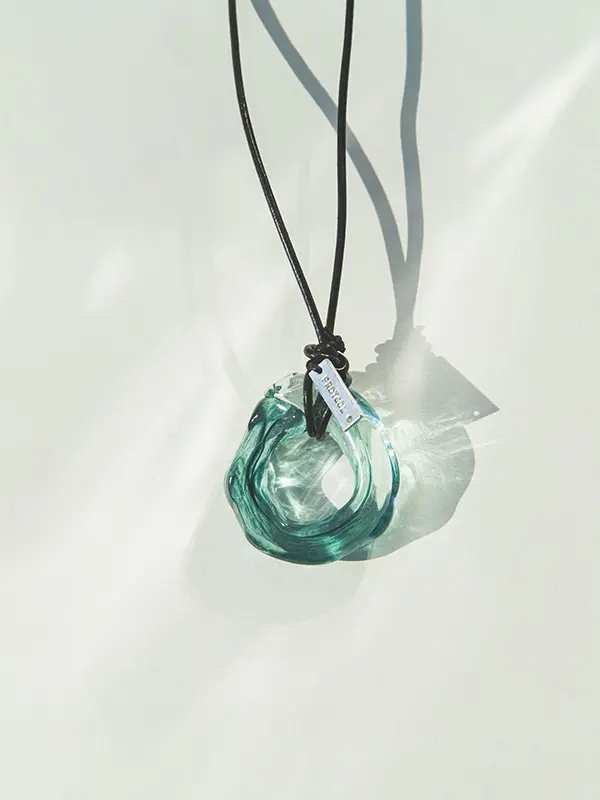 ガラスの透明感と反射、プラスチックにはないガラス特有の重さと輝きが、夏に向けた首元を彩ります。