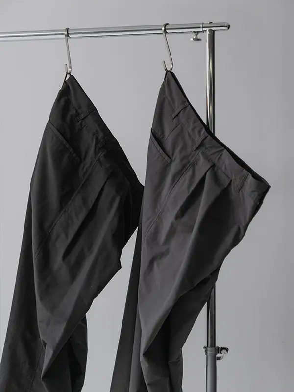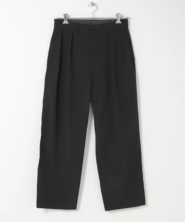 パンツはタック入りで程よい太さのシルエット。ウエストはゴムを入れず、ドローコードで調整可能。ゴム仕様ではないため、シャツやTシャツをインしたスタイリングもきれいに決まります。単体でもセットアップでも着回しやすいデザインです。