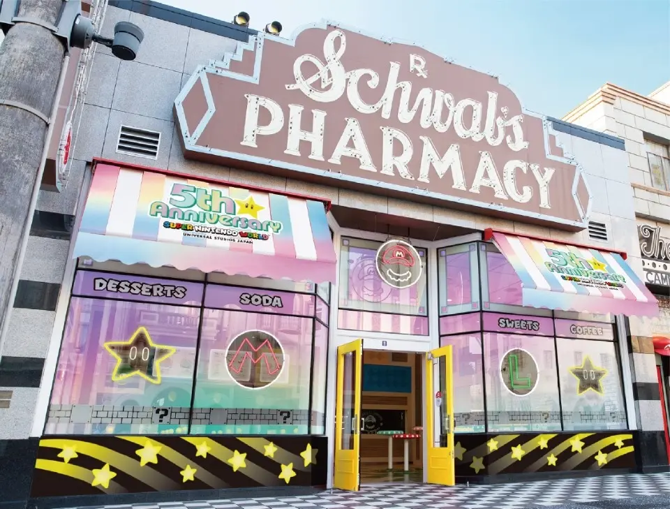 ハリウッド・エリアにある『マリオ・カフェ&ストア』では、「スーパースター」をモチーフにしたパンケーキが登場いたします。『スーパー・ニンテンドー・ワールド』を飛び出して、ハリウッド・エリアでも5周年をお祝いします。無敵!スーパースター・パンケーキサンド ~マンゴー~は、キラキラと輝くカラフルなパンケーキの中には、濃厚なマンゴー&クリームに加え、カリカリとした食感が楽しいスターの形をしたシュガーなど、見た目も味わいもワクワクするトッピングが詰まっています。「スーパースター」を手に入れた時のように“無敵”気分を味わえるスペシャルスウィーツで、食べるだけでパワーがみなぎる気分を味わえる5周年限定アイテムです。『マリオ・カフェ&ストア』の特別なドリンクも、今だけ「スーパースター」でキラキラにパワーアップ!ゼリーたっぷりのソーダを飲んで元気をチャージしてください。