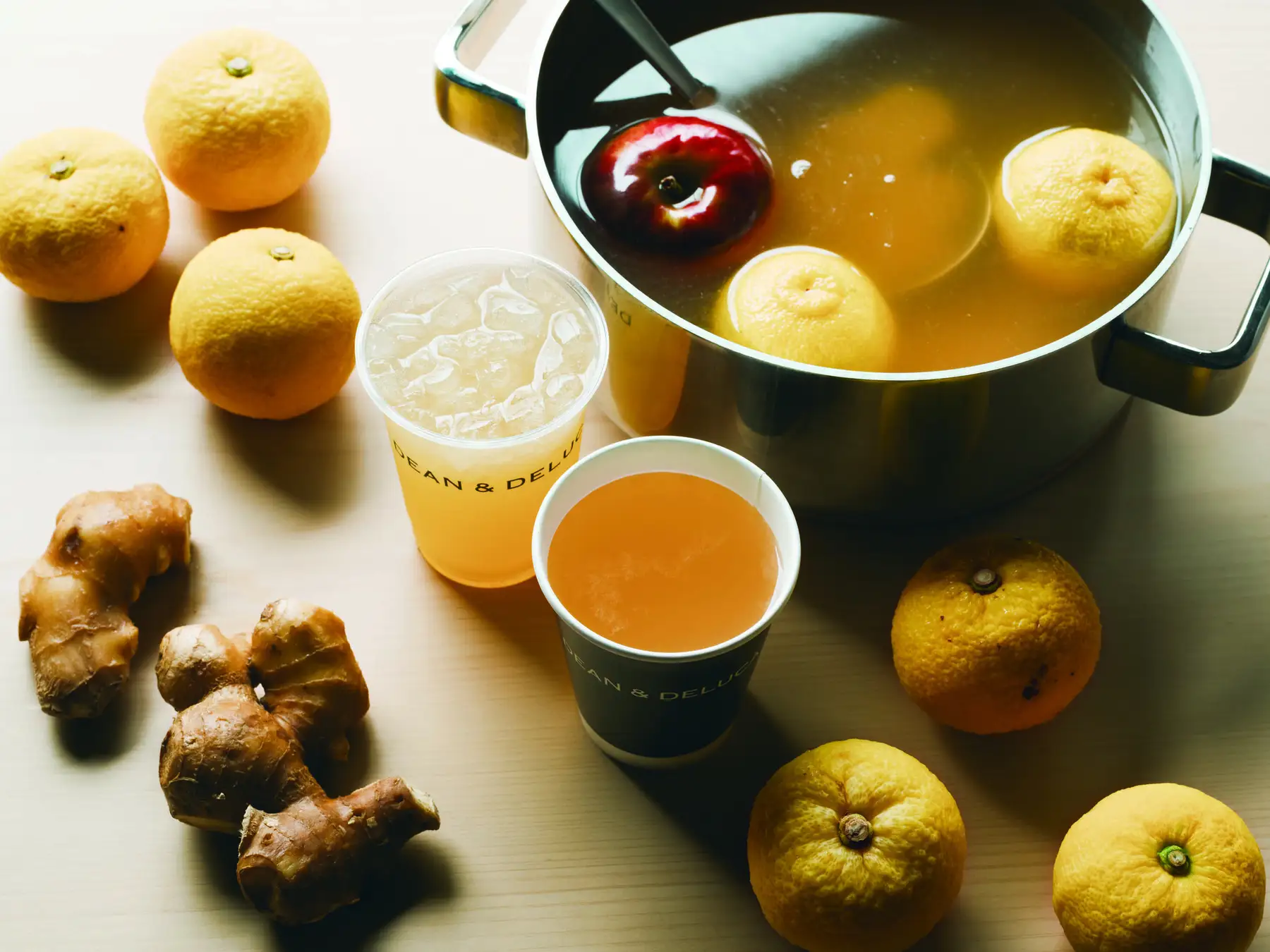大きな鍋に旬のりんご、ゆず、ジンジャーを入れて、店内でコトコト煮込んでつくる冬においしい自家製ジュースが今年も登場です。旬の黄ゆずの風味が爽やかに広がる、果実とジンジャーのホットジュースは、毎日素材から手作りしているため、店内は心を癒すゆずの香りに包まれます。