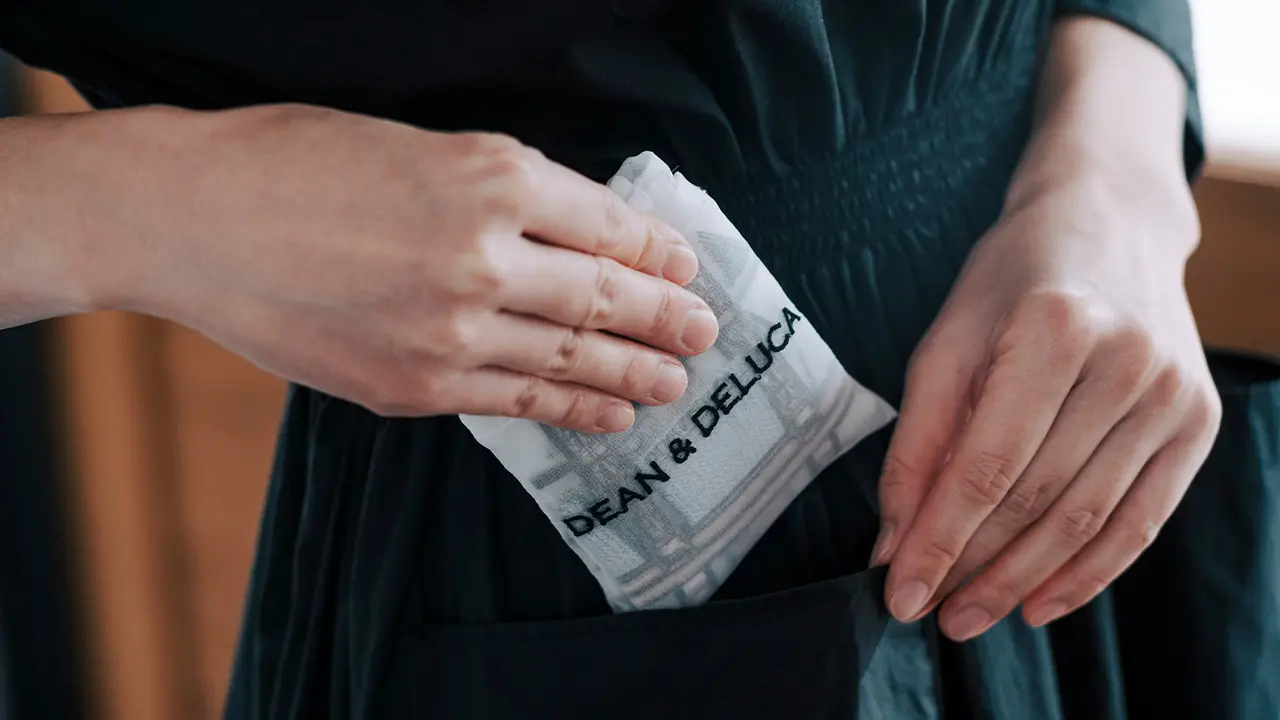 「使い捨てのビニールバッグではなく、繰り返し使えるバッグを使ってほしい」というデザイナーの想いが込められた本アイテムは、折りたたんで内側の小さいポケットにコンパクトに収納できます。小さなバッグにも入れやすく、日常使いしやすいのも嬉しいポイントです。