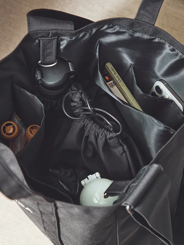 巾着ポーチは2サイズ展開で、大きいサイズには着替えを、小さいサイズにはマグや小物を収納可能。バッグと一緒に使うことで、荷物をすっきり整理できます。