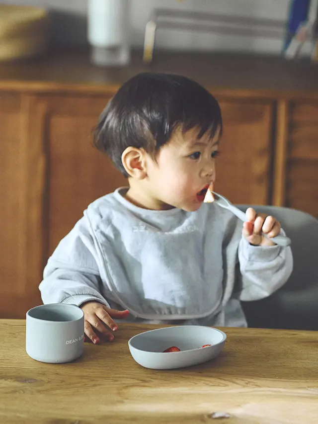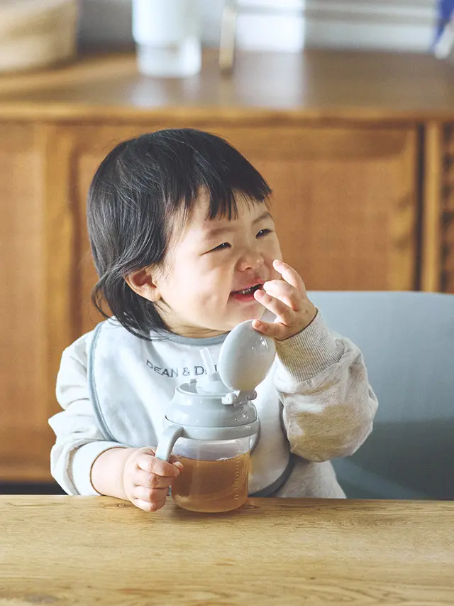 また、毎日の使いやすさにも配慮し、電子レンジや食洗機に対応した「樹脂の器やカトラリーのセット」もご用意。プレートとボウルは内側がわずかに反り返ったユニバーサルデザインで、最後のひとくちまできれいにすくい取れます。軽く割れにくく、はじめて使う食器としても安心です。同じライトグレーのカラーで、持ち運びに便利な「ストローマグ」も揃えています。