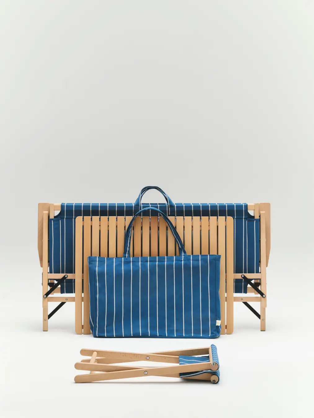 軽量なビーチ材のフレームと、ストライプ柄の再生ポリエステル素材のシートを組み合わせたこのソファは、座面と背もたれの両方にハンドルが付いており、持ち運びも簡単です。収納や移動に便利な同素材のバッグが付属します。