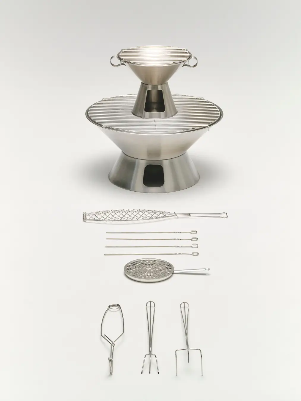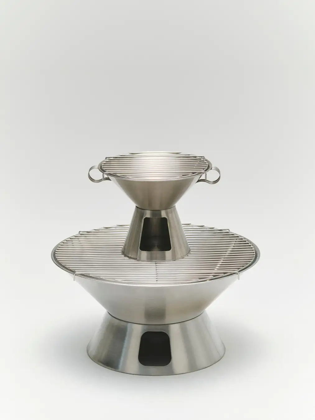 耐久性に優れたステンレススチール製で、無駄を削ぎ落としたコンパクトなフォルムが特徴です。両サイドにハンドルを備えているため持ち運びもスムーズ。庭先やテラス、キャンプ場など、場所を選ばず「思い立ったその時」に、本格的なバーベキューやグリル料理をお楽しみいただけます。