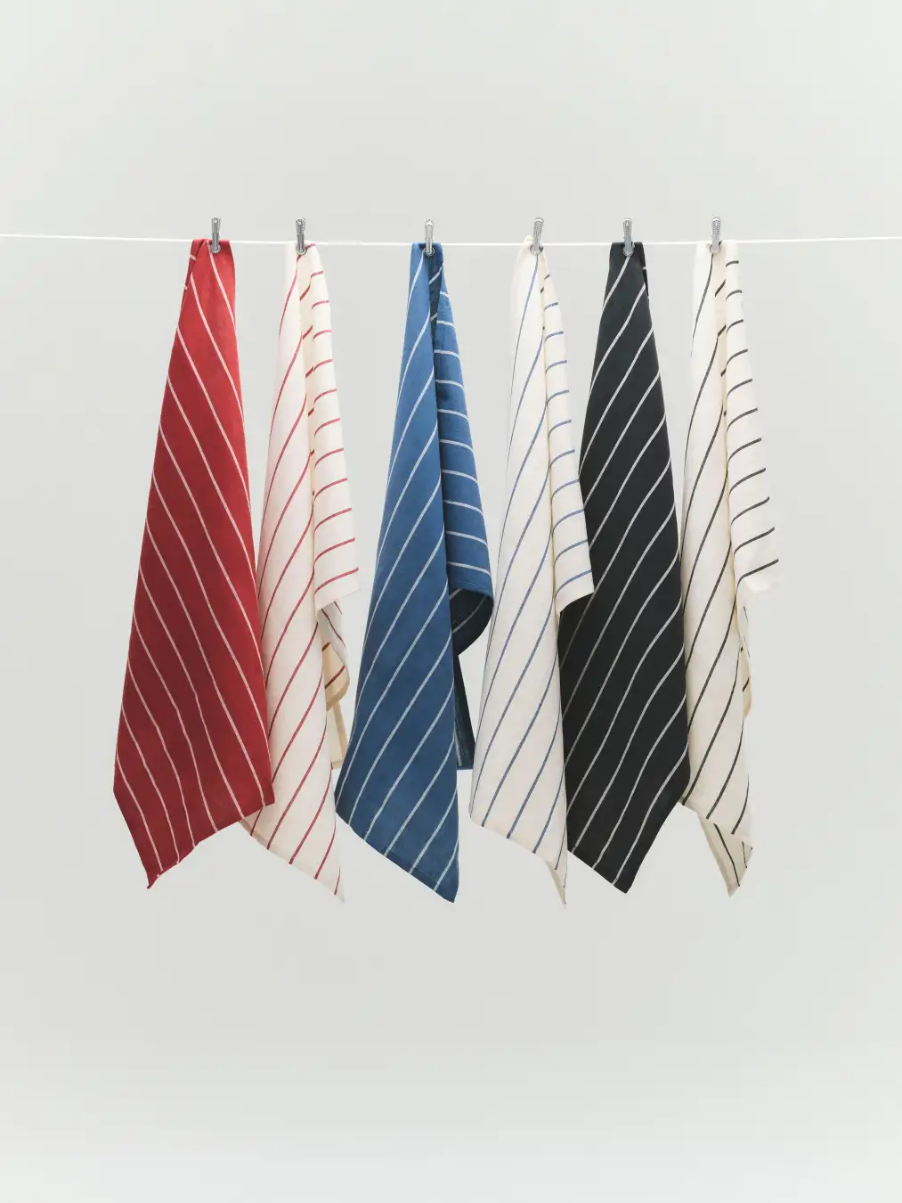 オーガニックコットン52%とリネン48%を混紡した生地は、吸水性が高く、使うほどに手に馴染む自然な風合いが魅力です。大胆なストライプ柄が特徴で、キッチンやアウトドア・ダイニングの空間に彩りとリズムを与えてくれます。洗い替えや用途別の使い分けに便利な2枚セットとなります。