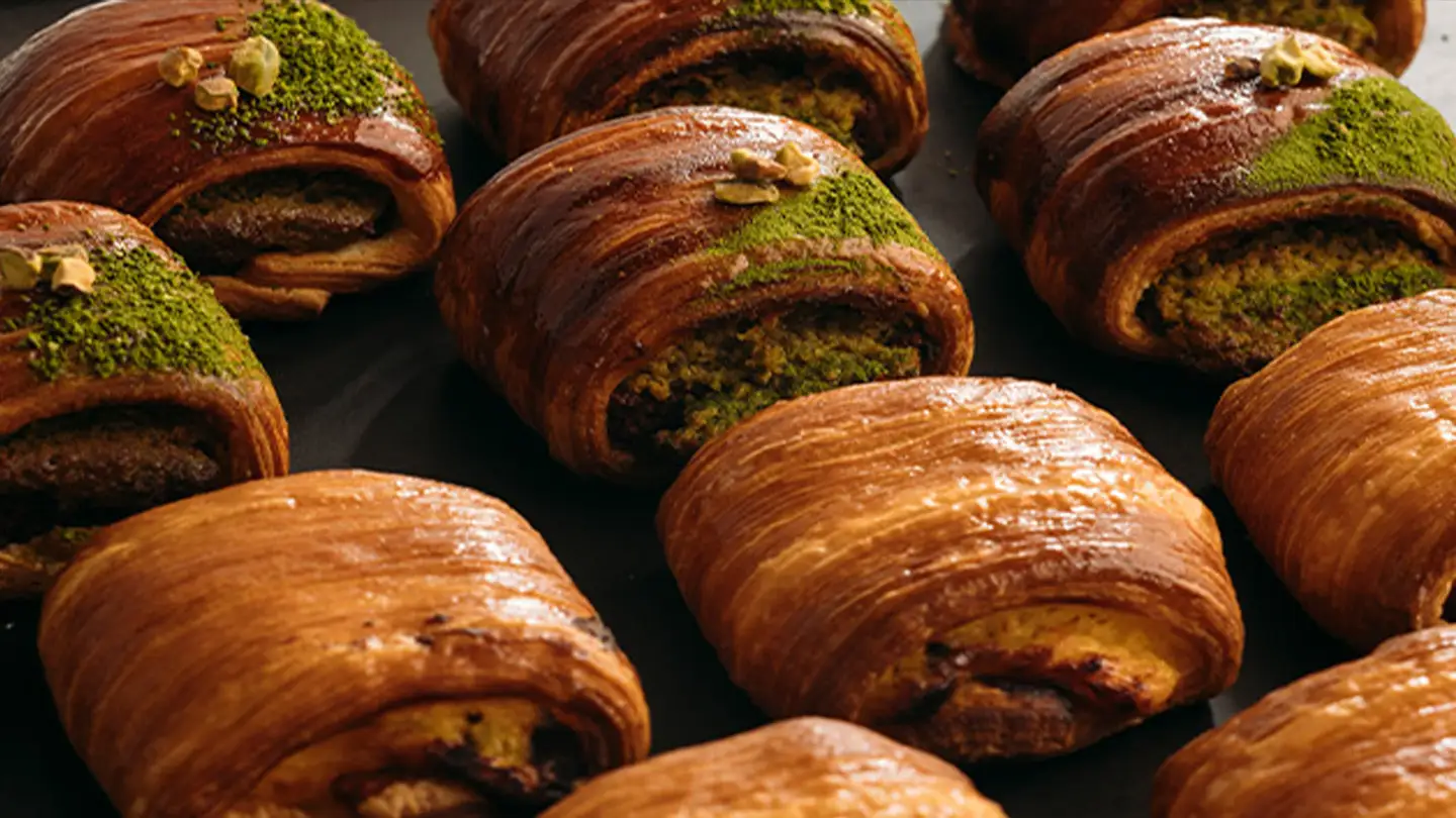 生地を何層にも重ねた縞模様が特徴の進化系クロワッサン「パンスイス」。カスタードやチョコレート、ピスタチオのクリームやレーズン入りブラウニーを包んで焼き上げました。表面はパリパリ、中はしっとりとした食感に仕上げています。