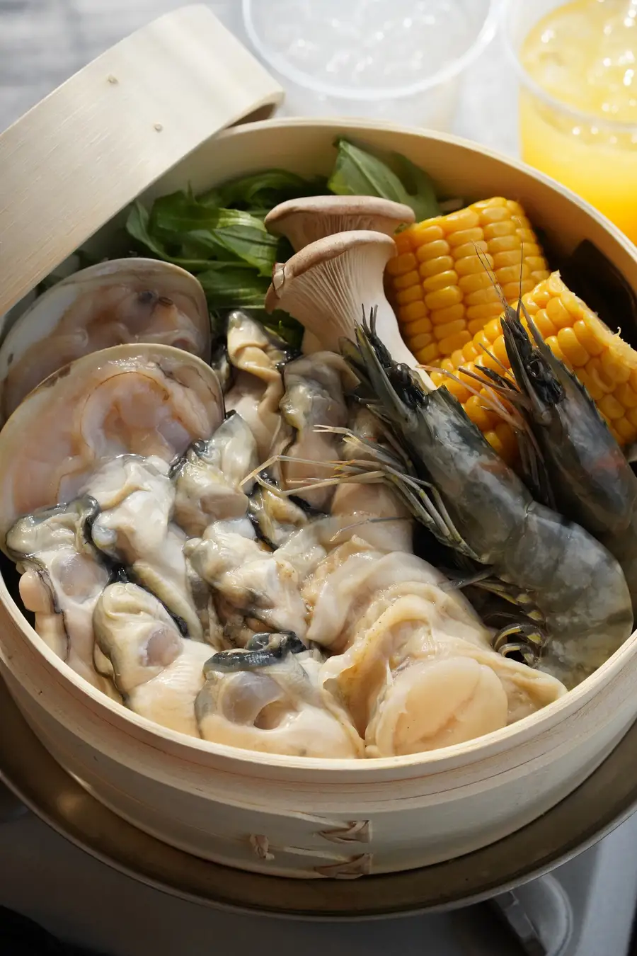 牡蠣・エビ・ホタテ・白はまぐり・コーンを、昆布を敷いたせいろでふっくら蒸し上げることで、素材の旨みを逃がさず、香り豊かに仕上げました。