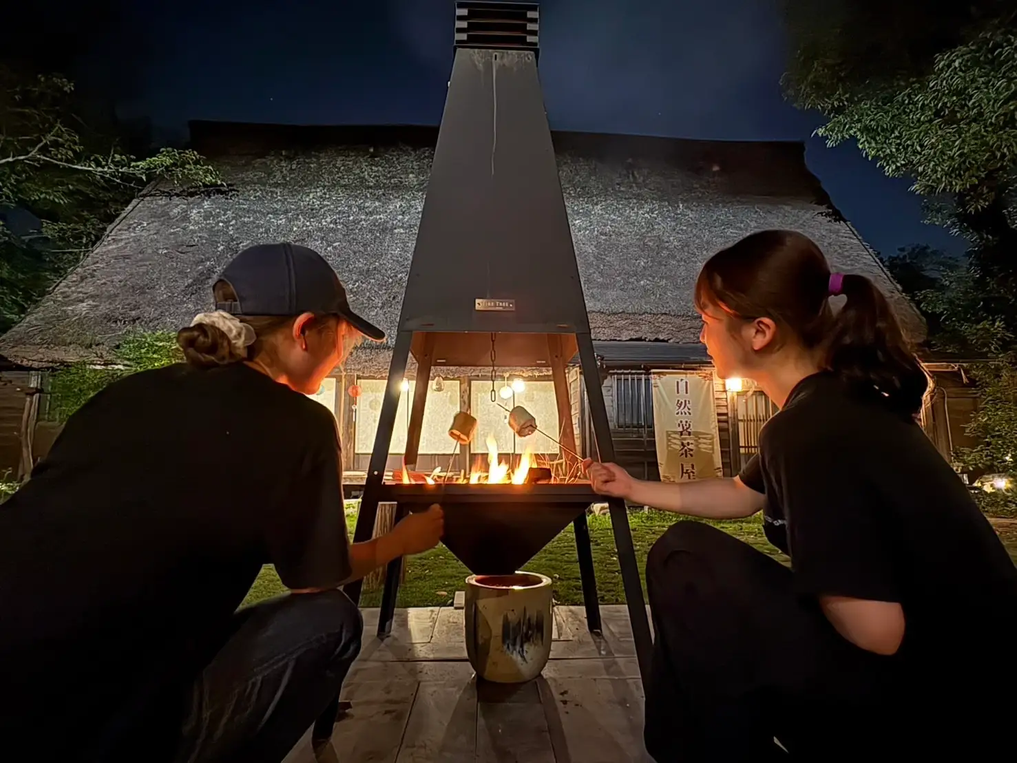 夜のハイライトは、施設のシンボルである岐阜県白川郷から移築された「合掌造り」の前で毎晩20:00から行われる焚き火ナイト。 パチパチと薪が爆ぜる音と、揺れる炎。特典の「手持ち花火」や「スモア(焼きマシュマロ)」を片手に、自然と仲間が集まる団らんの場です。