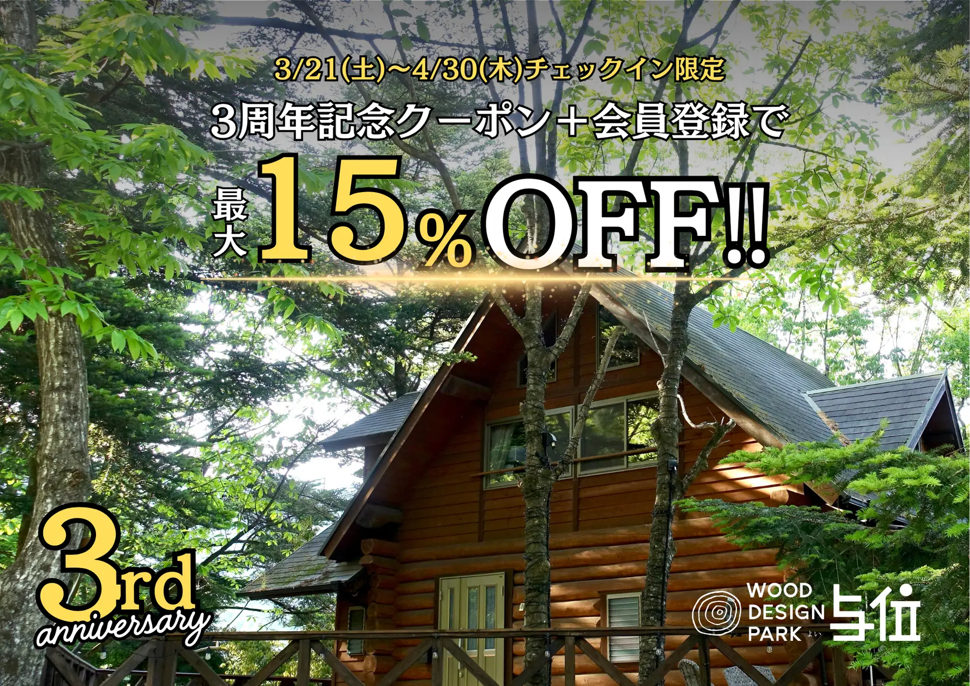 兵庫県宍粟市の温泉併設グランピング施設「ウッドデザインパーク与位」は、この度ゴールデンウィークを含む土日祝も対象となる3周年特別SALEを期間限定で開催することをお知らせします。